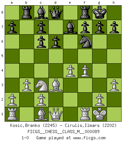 Last move : 1-0 2020 May 15 17:1:45 [Event "FICGS__CHESS__CLASS_M__000089"] [Site "FICGS"] [Date "2020.04.21"] [Round "1"] [White "Kosic,Branko"] [Black "Cirulis,Ilmars"] [Result "1-0"] [WhiteElo "2245"] [BlackElo "2202"] 1.e4 e5 2.Nf3 Nc6 3.Bb5 d6 4.d4 exd4 5.Nxd4 Bd7 6.Nc3 Nf6 7.O-O Be7 8.Nxc6 bxc6 9.Bd3 O-O 10.f4 Rb8 11.h3 Bc8 12.b3 1-0 Ruy Lopez : Old Steinitz defense Kingside Castling by player White (move 7) Kingside Castling by player Black (move 9) Player White won this chess game. Follow this game move after move (download)You know, comrade Pachman, I don't enjoy being a Minister, I would rather play Chess like you. (Che Guevara) Ein typischer, sehr verbreiteter Gedankenschädling ist der, daß der betreffende Amateur von der Annanhme ausgeht, daß jeder einzelne Zug etwas zu leisten habe. (Aaron Nimzowitsch) Cuando me preguntan: -¿Cual es el secreto que te hace hacer mejores movidas que tus oponentes?, Yo respondo: Me da gusto que me pregunten eso, porque, como veran, hay una simple razón. Yo pienso mis propias movidas y dejo a mi oponente que el piense las suyas. (Alexander Alekhine) Il s'avisa de me proposer d'apprendre les échecs qu'il jouait un peu... me voilà forcené des échecs. J'achète un échiquier, je m'enferme dans ma chambre, j'y passe des jours et des nuits à vouloir apprendre par cur toutes les parties. (Jean-Jacques Rousseau, Confessions) Plans are ideas that never come to fruition. (Daniel Parmet)