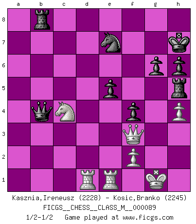 Last move : 1/2-1/2 2020 October 16 20:58:59 [Event "FICGS__CHESS__CLASS_M__000089"] [Site "FICGS"] [Date "2020.04.21"] [Round "1"] [White "Kasznia,Ireneusz"] [Black "Kosic,Branko"] [Result "1/2-1/2"] [WhiteElo "2228"] [BlackElo "2245"] 1.Nf3 c5 2.g3 Nc6 3.Bg2 e5 4.c4 g6 5.d3 Bg7 6.Nc3 Nge7 7.a3 d6 8.Rb1 a5 9.O-O O-O 10.b3 Rb8 11.e3 h6 12.Nd2 Be6 13.Nd5 b6 14.Bb2 Qd7 15.Bc3 Rfc8 16.Qe2 Kh7 17.Rfe1 f5 18.h4 Bf7 19.e4 b5 20.cxb5 Rxb5 21.Nxe7 Nxe7 22.Nc4 f4 23.a4 R5b8 24.Nxa5 Be6 25.gxf4 exf4 26.Bxg7 Kxg7 27.d4 cxd4 28.Qd2 Kh7 29.Qxd4 Bh3 30.Bf3 Bg4 31.Qd3 Rc5 32.b4 Rh5 33.e5 Bxf3 34.Qxf3 dxe5 35.Rbd1 Qxa4 36.Nc4 Qxb4 1/2-1/2 Reti Opening Kingside Castling by player White (move 9) Kingside Castling by player Black (move 9) This chess game ended in a draw. Follow this game move after move (download)No Chess Grandmaster is normal; they only differ in the extent of their madness. (Viktor Korchnoi) Ein Gewinn durch eine ungenaue Kombination, sei sie auch noch so vorzeigbar, erfüllt mich mit Schaudern. (Wilhelm Steinitz) Solo los afeminados hacen el Enroque. (Rob Sillars) On croit qu'il y a plus de mauvais joueurs que de bons joueurs, c'est faux : Il y a autant de joueurs qui gagnent que de joueurs qui perdent. (Philippe Geluck) If everyone is thinking alike, then somebody isn't thinking. (US General George S. Patton)