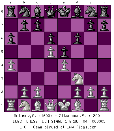 Last move : 1-0 2007 August 17 22:21:31 [Event "FICGS__CHESS__WCH_STAGE_1_GROUP_04__000003"] [Site "FICGS"] [Date "2007.07.11"] [Round "1"] [White "Antonov,Andrei"] [Black "Sitaraman,Praveen"] [Result "1-0"] [WhiteElo "1600"] [BlackElo "1300"] 1.e4 e5 2.Nf3 d6 3.d4 f6 4.d5 a6 5.a4 1-0 Philidor's defense Player White won this chess game. Follow this game move after move (download)When in doubt... play Chess ! (Tevis) Schach wird sich dank seiner hohen kulturellen Tradition immer durchsetzen. In näherer Zukunft womöglich sogar als Gegenreaktion auf die maßlose Reizüberflutung im Freizeit- und Spielbereich. (Garry Kasparov) El Ajedrez es tortura mental. (Garry Kasparov) 'L'échange des dames est un coup dur pour les deux adversaires...' Un journaliste lors d'une partie du match Spassky-Fischer The meaning of life is that it is to be lived, and it is not to be traded and conceptualized and squeezed into a pattern of systems. (Bruce Lee)