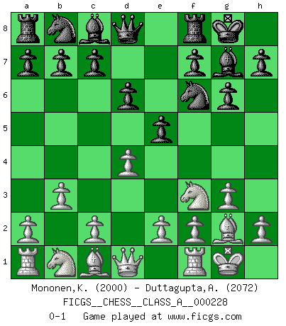 Last move : 0-1 2020 July 1 1:3:0 [Event "FICGS__CHESS__CLASS_A__000228"] [Site "FICGS"] [Date "2020.04.21"] [Round "1"] [White "Mononen,Kuuppo"] [Black "Duttagupta,Aniruddha"] [Result "0-1"] [WhiteElo "2000"] [BlackElo "2072"] 1.d4 Nf6 2.Nf3 g6 3.g3 Bg7 4.Bg2 O-O 5.O-O d6 6.b3 e5 0-1 This chess game has been lost on time (started : 2020.04.21 12:29:29) King's Indian : Fianchetto without c4 Kingside Castling by player Black (move 4) Kingside Castling by player White (move 5) Player Black won this chess game. Follow this game move after move (download)White lost because he failed to remember the right continuation and had to think up the moves himself. (Siegbert Tarrasch) Ein Buch ist ein Spiegel; wenn ein Affe hineinsieht, so kann kein Apostel heraus gucken. (Georg Christoph Lichtenberg) No hay precio que no valga la pena por la cabellera del Rey enemigo. (Koblentz) Aux échecs, l'amour-propre est satisfait quand on remporte la victoire, mais il n'y a pas de honte à être battu. (Benjamin Franklin) Somehow our devils are never quite what we expect when we meet them face to face. (Nelson DeMille)