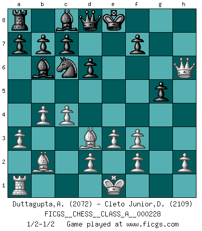 Last move : 1/2-1/2 2020 May 18 14:42:7 [Event "FICGS__CHESS__CLASS_A__000228"] [Site "FICGS"] [Date "2020.04.21"] [Round "1"] [White "Duttagupta,Aniruddha"] [Black "Cleto Junior,Dirceu"] [Result "1/2-1/2"] [WhiteElo "2072"] [BlackElo "2109"] 1.c4 e5 2.Nc3 Nf6 3.Nf3 Nc6 4.e3 Bb4 5.Qc2 O-O 6.Nd5 Re8 7.Qf5 d6 8.Nxf6+ gxf6 9.Qh5 e4 10.a3 exf3 11.gxf3 Re5 12.Rg1+ Rg5 13.Rxg5+ fxg5 14.Bd3 Ba5 15.Qxh7+ Kf8 16.Qh6+ Ke8 17.b4 Bb6 18.Bb2 1/2-1/2 English Opening Kingside Castling by player Black (move 5) This chess game ended in a draw. Follow this game move after move (download)Chess mastery essentially consists of analyzing Chess positions accurately. (Mikhail Botvinnik) Ich habe die besten Aussichten, den ersten Preis zu gewinnen - denn jeder muss gegen Steinitz spielen, nur ich nicht! (Wilhelm Steinitz) En la perfecta combinación de Ajedrez como en una historia corta de primera clase, toda la trama y contra trama deberá conducir hacia un final sorprendente, el interes no es mitigado hasta el último momento. (Yates and Winter) Pour se monter efficace, un Cavalier a besoin d'avant-postes ! Les Cavaliers font les meilleurs bloqueurs de pions passés. There is a very easy way to return from a casino with a small fortune : go there with a large one. (Jack Yelton)