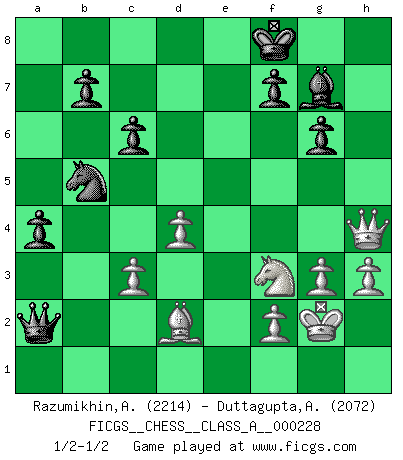 Last move : 1/2-1/2 2020 September 13 10:0:51 [Event "FICGS__CHESS__CLASS_A__000228"] [Site "FICGS"] [Date "2020.04.21"] [Round "1"] [White "Razumikhin,Andrey"] [Black "Duttagupta,Aniruddha"] [Result "1/2-1/2"] [WhiteElo "2214"] [BlackElo "2072"] 1.d4 Nf6 2.c4 g6 3.g3 c6 4.Bg2 d5 5.Qa4 Bg7 6.cxd5 Nxd5 7.Nf3 Bg4 8.Nbd2 Na6 9.O-O O-O 10.h3 Be6 11.Ne4 Bf5 12.Nc3 Nac7 13.Qb3 Qc8 14.Kh2 a5 15.Rd1 Nxc3 16.bxc3 a4 17.Qb4 Be4 18.Qxe7 Re8 19.Qh4 Bd5 20.Re1 Qf5 21.Bd2 Nb5 22.e4 Rxe4 23.Rxe4 Bxe4 24.Ng5 Bxg2 25.Qxh7+ Kf8 26.Kxg2 Re8 27.Nf3 Re2 28.Re1 Rxe1 29.Nxe1 Qd5+ 30.Nf3 Qxa2 31.Qh4 1/2-1/2 King's Indian : 3.g3 Kingside Castling by player White (move 9) Kingside Castling by player Black (move 9) This chess game ended in a draw. Follow this game move after move (download)I'm not afraid of Spassky. The world knows I'm the best. You don't need a match to prove it. (Bobby Fischer) Wenn es im Universum noch irgendwo intelligente Lebewesen gibt, dann kennen sie Go. (Emanuel Lasker) El muchacho (en ese entonces un niño de 12 años llamado Anatoly Karpov) no tiene ni idea de lo que es el Ajedrez y no hay futuro en absoluto para el en esta profesión. (Mikhail Botvinnik) Les réformistes prétendent que les progrès de la théorie conduiront à la disparition des échecs, et qu'il faut, pour leur rendre vie, en remanier les règles. En réalité, qu'exprime cette affirmation? Le mépris de l'intuition, de l'imagination et de tous les autres éléments qui font des échecs un art. (Alexander Alekhine) Crush them ! Make them suffer ! (General Grievous in Star Wars ep.3)