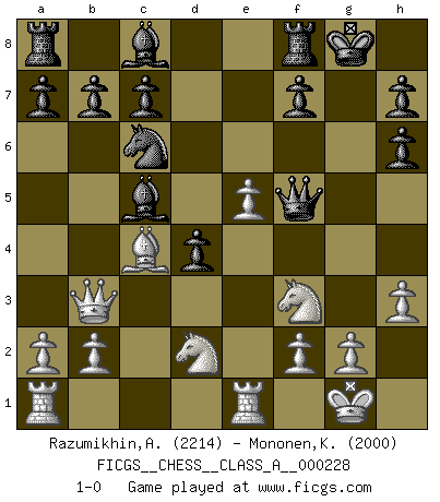 Last move : 1-0 2020 July 17 1:10:42 [Event "FICGS__CHESS__CLASS_A__000228"] [Site "FICGS"] [Date "2020.04.21"] [Round "1"] [White "Razumikhin,Andrey"] [Black "Mononen,Kuuppo"] [Result "1-0"] [WhiteElo "2214"] [BlackElo "2000"] 1.d4 d5 2.c4 dxc4 3.e4 e5 4.Nf3 exd4 5.Bxc4 Nc6 6.O-O Bc5 7.Qb3 Qf6 8.e5 Qf5 9.Bd3 Qe6 10.Bc4 Qf5 11.h3 Nh6 12.Re1 O-O 13.Bxh6 gxh6 14.Nbd2 1-0 This chess game has been lost on time (started : 2020.04.21 12:29:29) QGA : 3.e4 Kingside Castling by player White (move 6) Kingside Castling by player Black (move 12) Player White won this chess game. Follow this game move after move (download)You may learn much more from a game you lose than from a game you win. You will have to lose hundreds of games before becoming a good player. (Jose Raul Capablanca) Mit Schach schule ich mein Gefühl für Geometrie, was für Tennis und Schach gleichermaßen wichtig ist. (Boris Becker) Los libros de Ajedrez deben de usarse igual como usamos los anteojos: para mejorar la vista, aunque algunos jugadores los quieren usar como si ellos les otorgaran la vision. (José Raúl Capablanca) Toutes choses étant égales, c'est la conviction qui gagne. Alliée à une volonté de vaincre, elle sert de détonateur, suscite des idées, disperse les doutes et aide à penser clairement. (Robert Fischer) The Internet isn't free. It just has an economy that makes no sense to capitalism. (Brad Shapcott)