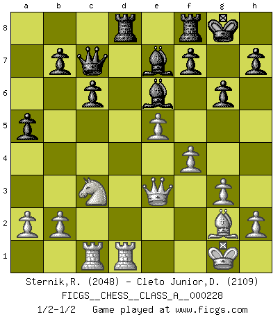 Last move : 1/2-1/2 2020 May 16 19:7:21 [Event "FICGS__CHESS__CLASS_A__000228"] [Site "FICGS"] [Date "2020.04.21"] [Round "1"] [White "Sternik,Ryszard"] [Black "Cleto Junior,Dirceu"] [Result "1/2-1/2"] [WhiteElo "2048"] [BlackElo "2109"] 1.c4 e5 2.Nc3 Nf6 3.Nf3 Nc6 4.g3 d5 5.cxd5 Nxd5 6.Bg2 Nb6 7.O-O Be7 8.e3 Be6 9.d4 exd4 10.exd4 O-O 11.Be3 a5 12.Ne5 Nxe5 13.dxe5 Nc4 14.Qe2 Nxe3 15.Qxe3 c6 16.f4 g6 17.Rfd1 Qc7 18.Rac1 Rad8 1/2-1/2 English Opening Kingside Castling by player White (move 7) Kingside Castling by player Black (move 10) This chess game ended in a draw. Follow this game move after move (download)All I want to do, ever, is just play Chess. (Bobby Fischer) Ein typischer, sehr verbreiteter Gedankenschädling ist der, daß der betreffende Amateur von der Annanhme ausgeht, daß jeder einzelne Zug etwas zu leisten habe. (Aaron Nimzowitsch) Cuando me preguntan: -¿Cual es el secreto que te hace hacer mejores movidas que tus oponentes?, Yo respondo: Me da gusto que me pregunten eso, porque, como veran, hay una simple razón. Yo pienso mis propias movidas y dejo a mi oponente que el piense las suyas. (Alexander Alekhine) J'ai vu le vaincu d'Echecs jouer des années durant dans l'espoir de la fête de la victoire. Car tu es plus riche de ce qu'elle existe si même elle n'est point pour toi. Ainsi de la perle du fond des mers. (Antoine de Saint-Exupéry) Macintosh - we might not get everything right, but at least we knew the century was going to end. (Douglas Adams)
