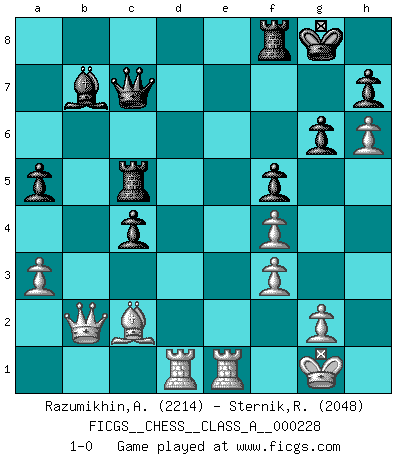 Last move : 1-0 2020 June 3 18:44:23 [Event "FICGS__CHESS__CLASS_A__000228"] [Site "FICGS"] [Date "2020.04.21"] [Round "1"] [White "Razumikhin,Andrey"] [Black "Sternik,Ryszard"] [Result "1-0"] [WhiteElo "2214"] [BlackElo "2048"] 1.d4 Nf6 2.c4 e6 3.Nf3 d5 4.Nc3 Be7 5.Bf4 O-O 6.e3 c5 7.dxc5 Bxc5 8.Qc2 Nc6 9.a3 Qa5 10.Rd1 Be7 11.Be2 dxc4 12.Bxc4 a6 13.O-O b5 14.Bb3 Bb7 15.Ne4 Qb6 16.Nfg5 Nxe4 17.Qxe4 Bxg5 18.Bc2 g6 19.Bxg5 Na5 20.Qg4 Qc6 21.Rc1 Rac8 22.h4 Nc4 23.h5 f5 24.Qg3 Qc7 25.Bf4 Qg7 26.b3 e5 27.h6 Qf7 28.bxc4 exf4 29.exf4 bxc4 30.Rfe1 Rc5 31.Qc3 Qf6 32.Qb4 Qc6 33.f3 a5 34.Qb2 Qc7 35.Rcd1 1-0 Queen's pawn game Kingside Castling by player Black (move 5) Kingside Castling by player White (move 13) Player White won this chess game. Follow this game move after move (download)By the beauty of his games, the clarity of his play, and the brilliance of his ideas, Fischer made himself an artist of the same stature as Brahms, Rembrandt, and Shakespeare. (David Levy) Ein Remis kann durch Wiederholung von drei Zügen oder durch einen schlechte Zug erreicht werden. (Savielly Grigorievitsch Tartakower) En la perfecta combinación de Ajedrez como en una historia corta de primera clase, toda la trama y contra trama deberá conducir hacia un final sorprendente, el interes no es mitigado hasta el último momento. (Yates and Winter) Le joueur d'Echecs qui veut atteindre le top est obligé de développer son propre credo créatif. Alexeï Stepanovicth Souétine. Il est facile d'écrire des livres ! Ce qui est difficile, c'est de jouer ! (Alexeï Stepanovicth Souétine) The meaning of life is that it is to be lived, and it is not to be traded and conceptualized and squeezed into a pattern of systems. (Bruce Lee)