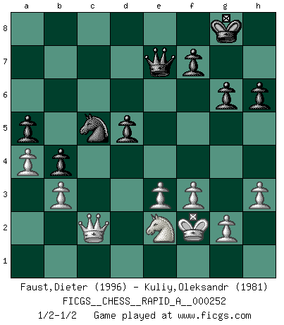 Last move : 1/2-1/2 2020 June 3 16:8:16 [Event "FICGS__CHESS__RAPID_A__000252"] [Site "FICGS"] [Date "2020.04.22"] [Round "1"] [White "Faust,Dieter"] [Black "Kuliy,Oleksandr"] [Result "1/2-1/2"] [WhiteElo "1996"] [BlackElo "1981"] 1.d4 d5 2.c4 e6 3.Nf3 a6 4.cxd5 exd5 5.Nc3 Nf6 6.Bg5 Be6 7.e3 Nbd7 8.Bd3 Bd6 9.O-O c6 10.Bf4 Qc7 11.Bxd6 Qxd6 12.h3 O-O 13.a3 h6 14.Qc2 a5 15.Rfd1 Rfe8 16.b3 Rec8 17.Qb2 b5 18.Rdc1 Nb6 19.a4 b4 20.Ne2 Nbd7 21.Ne5 c5 22.Bb5 cxd4 23.Nxd7 Bxd7 24.Qxd4 Ne4 25.Bxd7 Qxd7 26.f3 Nf6 27.Rd1 Rc2 28.Qd3 Rac8 29.Rac1 Rxc1 30.Rxc1 Rxc1+ 31.Nxc1 Qc6 32.Ne2 Nd7 33.Qd1 Nc5 34.Qc2 g6 35.Nd4 Qd6 36.Kf2 Qe7 37.Ne2 1/2-1/2 Queen's gambit declined Kingside Castling by player White (move 9) Kingside Castling by player Black (move 12) This chess game ended in a draw. Follow this game move after move (download)Human affairs are like a Chess game: only those who do not take it seriously can be called good players. (Hung Tzu Ch'eng) Der zweitbeste Zug ist oft der einzig richtige. (Savielly Grigorievitsch Tartakower) Una compensación adecuada por un sacrificio es tener una combinación sólida que conduce a una posición ganadora; una compensación adecuada por una metida de pata es dejar a tu oponente arrebatar una derrota de las fauces de la victoria. (Bruce A. Moon) Dieu déplace le joueur, et celui-ci la pièce. Quel Dieu derrière Dieu commence donc la trame ? Arturo Perez-Reverte (prix de littérature policière 1993). He who is a good ruler must first have been ruled. (Aristotle)