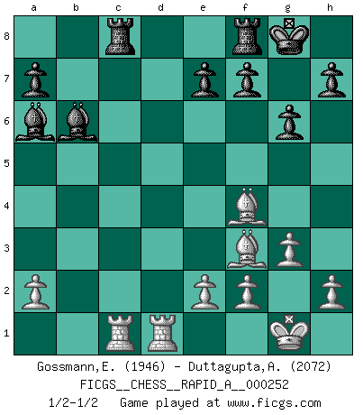 Last move : 1/2-1/2 2020 June 12 21:36:56 [Event "FICGS__CHESS__RAPID_A__000252"] [Site "FICGS"] [Date "2020.04.22"] [Round "1"] [White "Gossmann,Ewald"] [Black "Duttagupta,Aniruddha"] [Result "1/2-1/2"] [WhiteElo "1946"] [BlackElo "2072"] 1.Nf3 Nf6 2.g3 g6 3.Bg2 Bg7 4.d4 O-O 5.O-O d5 6.c4 c6 7.cxd5 cxd5 8.Nc3 Ne4 9.Ne5 Nxc3 10.bxc3 Nc6 11.Nxc6 bxc6 12.Qa4 Qb6 13.Re1 Qa6 14.Qxa6 Bxa6 15.Bf4 c5 16.Bxd5 Rad8 17.Bf3 cxd4 18.cxd4 Bxd4 19.Rac1 Rc8 20.Red1 Bb6 1/2-1/2 Reti : King's Indian attack Kingside Castling by player Black (move 4) Kingside Castling by player White (move 5) This chess game ended in a draw. Follow this game move after move (download)You cannot play at Chess if you are kind-hearted. (French Proverb) Wer sich die Fähigkeit anerziehen will im Schach selbstständig zu denken, der muß alles meiden, was leblos ist: ausgeklügelte Theorien, die sich auf sehr wenige Beispiele und eine Menge Hirngespinste stützen. (Emanuel Lasker) No existe un remordimiento como el remordimiento del Ajedrez. (H. G. Wells) Le système Elo représente seulement une moyenne. Il est simplement un indicateur de votre stabilité. (Anatoli Karpov) Pretend inferiority and encourage his arrogance. (Sun Tzu)
