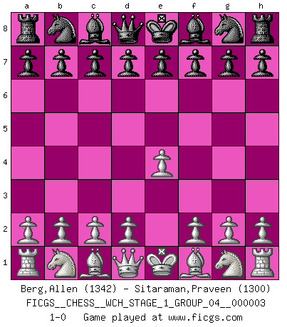 Last move : 1-0 2007 August 17 22:19:54 [Event "FICGS__CHESS__WCH_STAGE_1_GROUP_04__000003"] [Site "FICGS"] [Date "2007.07.11"] [Round "1"] [White "Berg,Allen"] [Black "Sitaraman,Praveen"] [Result "1-0"] [WhiteElo "1342"] [BlackElo "1300"] 1.e4 1-0 King's pawn Opening Player White won this chess game. Follow this game move after move (download)The defensive power of a pinned piece is only imaginary. (Aaron Nimzovich) Der Schachmeister von Heute braucht Courage, einen Killerinstinkt, Ausdauer und Arroganz. (Larry Evans) Las ideas audaces son como las piezas del Ajedrez que avanzan hacia adelante. Ellas pueden ser vencidas, pero también pueden iniciar una partida victoriosa. (Goethe) Ce n'est pas pour s'amuser qu'il joue aux échecs : il célèbre un culte. (Vladimir Nabokov) If you are good, you will be assigned all the work. If you are really good, you will get out of it. (Dan Rotaru)