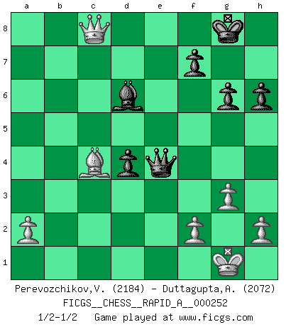 Last move : 1/2-1/2 2020 July 5 10:46:49 [Event "FICGS__CHESS__RAPID_A__000252"] [Site "FICGS"] [Date "2020.04.22"] [Round "1"] [White "Perevozchikov,Vjacheslav"] [Black "Duttagupta,Aniruddha"] [Result "1/2-1/2"] [WhiteElo "2184"] [BlackElo "2072"] 1.Nf3 Nf6 2.g3 g6 3.Bg2 Bg7 4.O-O O-O 5.d4 d6 6.c4 Nc6 7.Nc3 a6 8.d5 Na5 9.b3 Rb8 10.Bg5 h6 11.Bd2 c5 12.dxc6 Nxc6 13.Rc1 e5 14.Ne1 Ne7 15.e4 b5 16.Nc2 bxc4 17.bxc4 Nc6 18.Nd5 Nd4 19.Nxd4 exd4 20.Qf3 Nxd5 21.cxd5 Bd7 22.Qa3 Bb5 23.Ba5 Qf6 24.Bc7 Bxf1 25.Bxf1 Rbc8 26.Rc6 Rfe8 27.Bxd6 Rxc6 28.dxc6 Qe6 29.c7 Be5 30.Qxa6 Bxd6 31.Bc4 Qxe4 32.c8Q Rxc8 33.Qxc8+ 1/2-1/2 Reti : King's Indian attack Kingside Castling by player White (move 4) Kingside Castling by player Black (move 4) Promotion Queen by player White (move 32) This chess game ended in a draw. Follow this game move after move (download)A bad plan is better than none at all. (Frank Marshall) Alles was am Schachbrett zählt sind gute Züge. (Robert James Fischer) Bobby solo arroja las piezas y solas caen en las casillas correctas. (Miguel Najdorf ) 'L'échange des dames est un coup dur pour les deux adversaires...' Un journaliste lors d'une partie du match Spassky-Fischer May I never be complete. May I never be content. May I never be perfect. Deliver me, Tyler, from being perfect and complete. (Chuck Palahniuk, Fight Club)