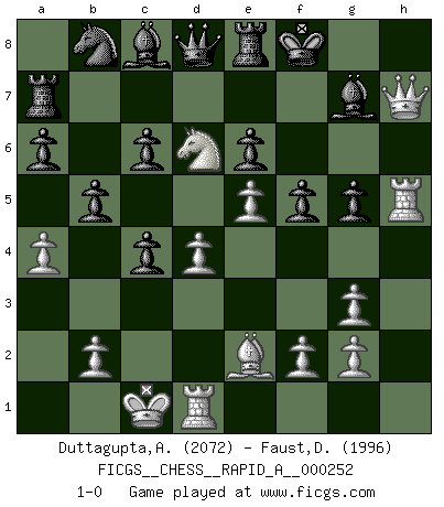Last move : 1-0 2020 June 14 15:18:0 [Event "FICGS__CHESS__RAPID_A__000252"] [Site "FICGS"] [Date "2020.04.22"] [Round "1"] [White "Duttagupta,Aniruddha"] [Black "Faust,Dieter"] [Result "1-0"] [WhiteElo "2072"] [BlackElo "1996"] 1.d4 Nf6 2.c4 e6 3.Nf3 d5 4.Nc3 c6 5.Bg5 h6 6.Bh4 dxc4 7.e4 g5 8.Bg3 b5 9.Be2 Bg7 10.e5 Nh5 11.a4 a6 12.Ne4 O-O 13.Nfxg5 Nxg3 14.hxg3 hxg5 15.Qc2 Re8 16.Nd6 Ra7 17.Qh7+ Kf8 18.Rh5 f5 19.O-O-O 1-0 Queen's pawn game Kingside Castling by player Black (move 12) Queenside Castling by player White (move 19) Player White won this chess game. Follow this game move after move (download)There are tough players and nice guys, and I'm a tough player. (Bobby Fischer) Wer der Ansicht ist, daß alle Schachspieler verrückt sind, wird durch Studium des Lebens von Emil Josef Diemer nicht auf andere Gedanken kommen. (Hans Ree) Buenas posiciones no logran ganar juegos, buenas movidas sí. (Gerald Abrahams) Les échecs, c'est l'art d'analyser. (Mikhail Botvinnik) There are lots of people who mistake their imagination for their memory. (Josh Bilings)