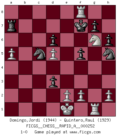 Last move : 1-0 2020 June 15 20:9:47 [Event "FICGS__CHESS__RAPID_A__000252"] [Site "FICGS"] [Date "2020.04.22"] [Round "1"] [White "Domingo,Jordi"] [Black "Quintero,Raul"] [Result "1-0"] [WhiteElo "1944"] [BlackElo "1929"] 1.g4 d5 2.Bg2 e5 3.c4 Be6 4.Qb3 Nd7 5.cxd5 Bxg4 6.Qxb7 Bd6 7.Qb3 Ngf6 8.Nc3 O-O 9.d3 Nc5 10.Qc2 Rb8 11.Rb1 Re8 12.b4 Ncd7 13.b5 Qe7 14.Bd2 Nb6 15.a4 Nh5 16.Bf3 Qh4 17.a5 Nd7 18.Bxg4 Qxg4 19.Nf3 Nf8 20.Ne4 Qd7 21.Qc6 h6 22.Rg1 Kh8 23.Be3 f5 24.Qxd7 Nxd7 25.Nxd6 cxd6 26.Bxa7 Ra8 27.b6 e4 28.Nd4 exd3 29.Ne6 Nc5 30.b7 Rxa7 31.b8Q Rxb8 32.Rxb8+ Kh7 33.Nf8+ Kg8 34.Ng6 Kf7 35.Rf8+ 1-0 Grob's attack Kingside Castling by player Black (move 8) Promotion Queen by player White (move 31) Player White won this chess game. Follow this game move after move (download)A thorough understanding of the typical mating continuations makes the most complicated sacrificial combinations leading up to them not only not difficult, but almost a matter of course. (Siegbert Tarrasch) Ich hatte Zahnschmerzen im ersten Spiel. In der zweiten Partie tat mir der Kopf weh. In der dritten war es eine Rheuma-Attacke und während der vierten fühlte ich mich nicht gut. Und in der fünften? Nun, man muss doch nicht jedes Spiel gewinnen, oder? (Savielly Grigorievitsch Tartakower) Cuando me preguntan: -¿Cual es el secreto que te hace hacer mejores movidas que tus oponentes?, Yo respondo: Me da gusto que me pregunten eso, porque, como veran, hay una simple razón. Yo pienso mis propias movidas y dejo a mi oponente que el piense las suyas. (Alexander Alekhine) Les Echecs, c'est l'art de la guerre sans les charniers, c'est la résurrection des morts tombés au champ d'honneur, l'espoir perpétuel, la suprématie de l'intelligence sur la force, la culture de l'esprit. (F. Szpiner) Those who make the worst use of their time are the first to complain of its brevity. (Jean de la Bruyere)