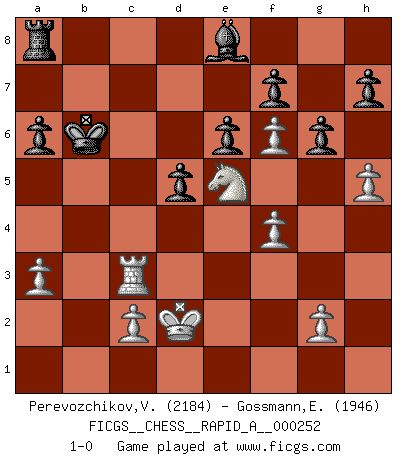 Last move : 1-0 2020 April 27 17:4:36 [Event "FICGS__CHESS__RAPID_A__000252"] [Site "FICGS"] [Date "2020.04.22"] [Round "1"] [White "Perevozchikov,Vjacheslav"] [Black "Gossmann,Ewald"] [Result "1-0"] [WhiteElo "2184"] [BlackElo "1946"] 1.e4 e6 2.d4 d5 3.Nc3 Nf6 4.e5 Nfd7 5.f4 c5 6.Nf3 Nc6 7.Be3 a6 8.Qd2 b5 9.a3 Qb6 10.Ne2 Na5 11.Ng3 Nc4 12.Bxc4 bxc4 13.Nh5 g6 14.dxc5 Bxc5 15.Nf6+ Nxf6 16.Bxc5 Qxc5 17.exf6 Rb8 18.O-O-O Bd7 19.Qd4 Qxd4 20.Rxd4 Kd8 21.Ne5 Kc7 22.h4 Rhc8 23.Rh3 Be8 24.Rc3 Kb7 25.b3 cxb3 26.Rb4+ Ka7 27.R4xb3 Ra8 28.Kd2 Rxc3 29.Rxc3 Kb6 30.h5 1-0 French : Steinitz, Boleslavsky variation Queenside Castling by player White (move 18) Player White won this chess game. Follow this game move after move (download)Fischer Chess play was always razor-sharp, rational and brilliant. One of the best ever. (Dave Regis) Mit sehr nachdenklichem Gesicht schreitet Bobby durch den Turniersaal. Was ist passiert?, fragt Lombardy. Ich stehe schlecht, antwortet Fischer. Lombardy: Dann biete doch einfach Remis an. Fischer: So schlecht stehe ich nun auch wieder nicht! (Robert James Fischer) No es suficiente ser un buen jugador, se debe también de jugar bién. (Siegbert Tarrasch) La vie est comme un jeu d'échecs : nous esquissons un plan, mais celui-ci est tributaire de ce que daignent faire l'adversaire aux échecs et le destin dans la vie. (Arthur Schopenhauer) Only sick music makes money today. (Friedrich Nietzsche)