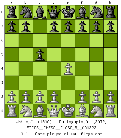 Last move : 0-1 2020 June 2 23:55:24 [Event "FICGS__CHESS__CLASS_B__000322"] [Site "FICGS"] [Date "2020.04.23"] [Round "1"] [White "White,Joshua"] [Black "Duttagupta,Aniruddha"] [Result "0-1"] [WhiteElo "1800"] [BlackElo "2072"] 1.e4 c5 0-1 This chess game has been lost on time (started : 2020.04.23 10:39:56) Sicilian defense Player Black won this chess game. Follow this game move after move (download)It is peculiar but a fact nevertheless, that gamblers in chess always have enthusiastic followers. (Botvinnik) Es ist nicht das erste mal, dass sich die FIDE dem Arabischen Geld gebeugt hat (über die FIDE WM 2004 in Lybien). (Larry Evans) No es tiempo de jugar al Ajedrez cuando la casa esta en llamas. (Proverbio Italiano) Il a essayé de se convaincre qu'il pourrait empêcher toutes les erreurs et ne jamais perdre. L'horreur ! Gary Kasparov au sujet de Robert Fischer. The only thing that matters is the evidence. (Horatio Caine, C.S.I. Miami)