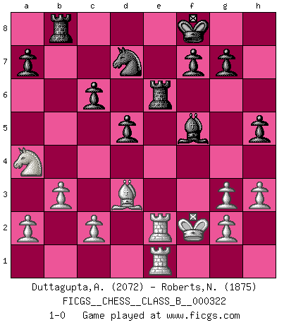 Last move : 1-0 2020 November 28 16:52:3 [Event "FICGS__CHESS__CLASS_B__000322"] [Site "FICGS"] [Date "2020.04.23"] [Round "1"] [White "Duttagupta,Aniruddha"] [Black "Roberts,Neil"] [Result "1-0"] [WhiteElo "2072"] [BlackElo "1875"] 1.e4 e5 2.Nf3 Nf6 3.Nc3 Nc6 4.d4 exd4 5.Nxd4 Bb4 6.Nxc6 bxc6 7.Bd3 d5 8.exd5 cxd5 9.O-O O-O 10.h3 Re8 11.Qf3 c6 12.Bf4 Bd6 13.b3 Qc7 14.Bxd6 Qxd6 15.Na4 Be6 16.Qg3 Qxg3 17.fxg3 h5 18.Rae1 Nd7 19.Ba6 Rab8 20.Rf2 Kf8 21.Rfe2 Bf5 22.Kf2 Re6 23.Bd3 1-0 This chess game has been lost on time (started : 2020.04.23 10:39:56) Follow this game move after move (download)Pawns: they are the soul of this game, they alone form the attack and defense. (Philidor) Glücklicherweise sind Großmeister Ruben Fines reine Schachbücher weniger phallozentrisch [als seine Schachpsychologie] und deswegen auch weniger lächerlich. (Nigel Short) Si yo gano un torneo, yo lo gano por mí mismo. Yo hago las jugadas. Nadie me ayuda. (Bobby Fischer) Dieu déplace le joueur, et celui-ci la pièce. Quel Dieu derrière Dieu commence donc la trame ? Arturo Perez-Reverte (prix de littérature policière 1993). Two beer, or not two beer. (Unknown)
