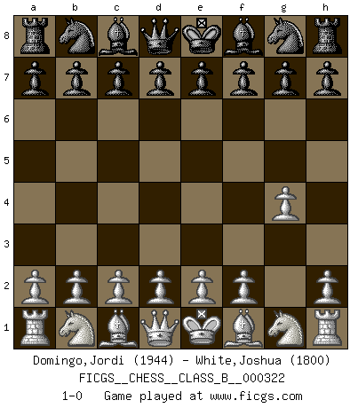 Last move : 1-0 2020 June 4 1:2:21 [Event "FICGS__CHESS__CLASS_B__000322"] [Site "FICGS"] [Date "2020.04.23"] [Round "1"] [White "Domingo,Jordi"] [Black "White,Joshua"] [Result "1-0"] [WhiteElo "1944"] [BlackElo "1800"] 1.g4 1-0 This chess game has been lost on time (started : 2020.04.23 10:39:56) Grob's attack Player White won this chess game. Follow this game move after move (download)Different people feel differently about resigning. (Bobby Fischer) Capablanka war das größte Genie der Schachgeschichte! Aber denken sie nicht er habe nichts vom Schach verstanden. Er wusste nur soviel wie er wissen musste um seine Ziele zu erreichen. (Mikhail Moiseyevich Botvinik) ¿Cual es el objetivo de jugar una apertura de gambito?... Para adquirir una reputación de ser un jugador apuesto a costo de perder el juego. (Siegbert Tarrasch) Le système Elo représente seulement une moyenne. Il est simplement un indicateur de votre stabilité. (Anatoli Karpov) When you stop learning you start dying. (Scott Adams)