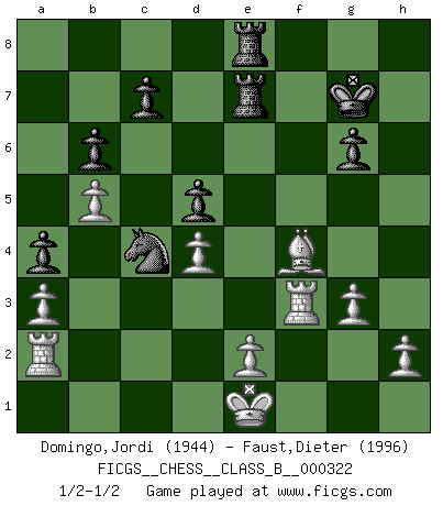 Last move : 1/2-1/2 2020 June 19 16:47:5 [Event "FICGS__CHESS__CLASS_B__000322"] [Site "FICGS"] [Date "2020.04.23"] [Round "1"] [White "Domingo,Jordi"] [Black "Faust,Dieter"] [Result "1/2-1/2"] [WhiteElo "1944"] [BlackElo "1996"] 1.b4 a5 2.b5 b6 3.Nf3 d6 4.g3 Bb7 5.Bg2 g6 6.Bb2 e5 7.d4 e4 8.Nfd2 f5 9.f3 d5 10.c4 Nf6 11.Nc3 Bb4 12.a3 Bxc3 13.Bxc3 O-O 14.fxe4 Ng4 15.Bh3 Ne3 16.Qc1 fxe4 17.Nxe4 Nxc4 18.Qh6 Qe7 19.Ng5 Nd7 20.Be6+ Kh8 21.Nxh7 Qxh7 22.Qxh7+ Kxh7 23.Bxd7 Rf7 24.Bh3 Re8 25.Rf1 Rfe7 26.Rf2 Bc8 27.Bxc8 Rxc8 28.Bd2 a4 29.Ra2 Kg7 30.Rf3 Rce8 31.Bf4 Ra8 32.Ra1 Rae8 33.Ra2 Ra8 34.Ra1 Rae8 35.Ra2 1/2-1/2 Polish (Sokolsky) opening Kingside Castling by player Black (move 13) This chess game ended in a draw. Follow this game move after move (download)An attack on the wing should be met by play in the center. (Nimzovitch) Früher wurde jeder komplizierte Zug, jedes interessante Opfer mit großem Beifall und Enthusiasmus aufgenommen. Heute schaltet man einfach seinen Fritz an, und man kann sehen, was los ist, ob der Zug geht oder nicht. (Vladimir Kramnik) Bobby es el jugador de Ajedrez mas fino que este país jamás haya producido. Su memoria para las movidas, su brillantez en soñar combinaciones y su feróz determinación por la victoria son algo extraño. (John Collins) Vouloir jouer aux échecs contre soi-même est aussi paradoxal que vouloir marcher sur son ombre. (Stefan Zweig) Now you put water in a cup, it becomes the cup; You put water into a bottle it becomes the bottle; You put it in a teapot it becomes the teapot. Water can flow or it can crash. Be water, my friend. (Bruce Lee)
