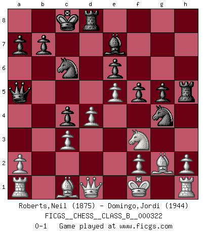 Last move : 0-1 2020 November 14 19:0:3 [Event "FICGS__CHESS__CLASS_B__000322"] [Site "FICGS"] [Date "2020.04.23"] [Round "1"] [White "Roberts,Neil"] [Black "Domingo,Jordi"] [Result "0-1"] [WhiteElo "1875"] [BlackElo "1944"] 1.d4 d5 2.Bf4 Nf6 3.e3 c5 4.c3 Nc6 5.Nd2 Bf5 6.Qb3 Qd7 7.Ngf3 c4 8.Qd1 e6 9.Nh4 Bg6 10.Nxg6 hxg6 11.e4 Nh5 12.Be3 f5 13.g4 Nf6 14.gxf5 gxf5 15.e5 Ng4 16.Bf4 Be7 17.Nf3 O-O-O 18.b3 Rh5 19.bxc4 dxc4 20.Bg2 g5 21.Bc1 Qd5 22.Kf1 Qa5 0-1 This chess game has been lost on time (started : 2020.04.23 10:39:56) Follow this game move after move (download)With or without the title, Bobby Fischer was unquestionably the greatest player of his time. (Burt Hochberg) Als ich elf wurde, wurde ich einfach gut. (Robert James Fischer) Yo no le temo a Spassky. Todos saben que yo soy el mejor. Uno no necesita un torneo para probarlo. (Bobby Fischer) Les échecs, c'est l'art d'analyser. (Mikhail Botvinnik) Memory... is the diary that we all carry with us. (Oscar Wilde, The Importance of Being Earnest)