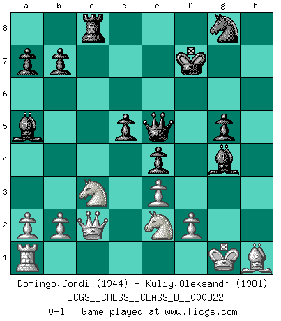 Last move : 0-1 2020 August 6 20:28:21 [Event "FICGS__CHESS__CLASS_B__000322"] [Site "FICGS"] [Date "2020.04.23"] [Round "1"] [White "Domingo,Jordi"] [Black "Kuliy,Oleksandr"] [Result "0-1"] [WhiteElo "1944"] [BlackElo "1981"] 1.g4 d5 2.Bg2 c6 3.g5 e5 4.d4 e4 5.c4 h6 6.h4 hxg5 7.Bxg5 Be7 8.Qd2 Nd7 9.Nc3 Nb6 10.cxd5 cxd5 11.Nh3 f6 12.Bf4 Bf5 13.Bg3 Rc8 14.Qc2 g5 15.hxg5 fxg5 16.Be5 Rh4 17.Bg3 Rh5 18.Ng1 Rxh1 19.Bxh1 Nc4 20.Qb3 Qd7 21.e3 Bd8 22.Nge2 Ba5 23.Qc2 Bg4 24.Kf1 Kf7 25.Be5 Qf5 26.Kg1 Nxe5 27.dxe5 Qxe5 0-1 Grob : Spike attack Player Black won this chess game. Follow this game move after move (download)Half the variations which are calculated in a tournament game turn out to be completely superfluous. Unfortunately, no one knows in advance which half. (Jan Tinman) Der 70jährige Viktor Kortschnoi: Die Rentenanstalt wollte mich zwingen in Rente zu gehen. Meine Frau erhält jetzt eine Pension- und ich zahle weiter in die Rentenkasse ein! (Viktor Kortschnoi) No volvere nunca a jugar contigo. Has insultado a mi amigo. - cuando un oponente se maldijo por una mala jugada (Miguel Najdorf) À la honte des hommes, on sait que les lois du jeu sont les seules qui soient partout justes, claires, inviolables et exécutées. Pourquoi l'Indien qui a donné les règles du jeu d'échecs est-il obéi de bon gré dans toute la terre, et que les décrétales des papes, par exemple, sont aujourd'hui un objet d'horreur et de mépris ? C'est que l'inventeur des échecs combina tout avec justesse pour la satisfaction des joueurs, et que les papes, dans leurs décrétales, n'eurent en vue que leur seul avantage. L'Indien voulut exercer également l'esprit des hommes et leur donner du plaisir; les papes ont voulu abrutir l'esprit des hommes. Voltaire (Dictionnaire philosophique / Garnier 1967) Drag your thoughts away from your troubles... by the ears, by the heels, or any other way you can manage it. (Mark Twain)