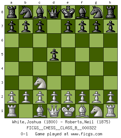 Last move : 0-1 2020 June 2 11:18:14 [Event "FICGS__CHESS__CLASS_B__000322"] [Site "FICGS"] [Date "2020.04.23"] [Round "1"] [White "White,Joshua"] [Black "Roberts,Neil"] [Result "0-1"] [WhiteElo "1800"] [BlackElo "1875"] 1.Nc3 d5 0-1 This chess game has been lost on time (started : 2020.04.23 10:39:56) Dunst (Sleipner, Heinrichsen) Opening Player Black won this chess game. Follow this game move after move (download)To avoid losing a piece, many a person has lost the game. (Savielly Tartakover) Versuche, dich von der Sklaverei der Eröffnungsvarianten zu befreien. Stattdessen soll man gewisse Typenpositionen erlernen, die man eingehend analysiert. (Aaron Nimzowitsch) El Ajedrez es como la guerra en un tablero. (Bobby Fischer) Il n'y a plus de joueurs du niveau de Jacob Murray dont la seule quête est le beau jeu, le plaisir de voir les pièces construire quelque chose. Sur 10 idées à la minute, 9 seront sans intérêt, la dernière s'avèrera géniale. (Christian Bauer) Gambling is the son of avarice and the father of despair. (French proverb)
