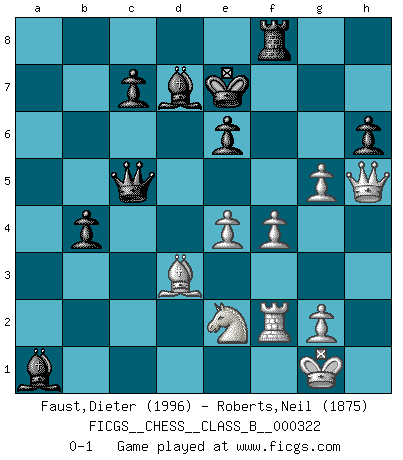 Last move : 0-1 2020 October 7 16:33:28 [Event "FICGS__CHESS__CLASS_B__000322"] [Site "FICGS"] [Date "2020.04.23"] [Round "1"] [White "Faust,Dieter"] [Black "Roberts,Neil"] [Result "0-1"] [WhiteElo "1996"] [BlackElo "1875"] 1.d4 Nf6 2.c4 e6 3.Nf3 d5 4.Bg5 dxc4 5.Nc3 a6 6.a4 Nc6 7.e4 h6 8.Bxf6 Qxf6 9.Bxc4 g5 10.h3 Bd7 11.d5 Ne5 12.dxe6 fxe6 13.Nxe5 Qxe5 14.Qh5+ Ke7 15.Rd1 b5 16.axb5 axb5 17.Bd3 Bg7 18.O-O b4 19.Ne2 Rhf8 20.h4 Qxb2 21.hxg5 Qe5 22.f4 Qc5+ 23.Rf2 Ra1 24.Rxa1 Bxa1 0-1 Queen's pawn game Kingside Castling by player White (move 18) Player Black won this chess game. Follow this game move after move (download)I give 98 percent of my mental energy to Chess. Others give only 2 percent. (Bobby Fischer) Wenn sie aufgeben, dann danke ich Ihnen für das Spiel (Eventualzug beim Fernschach). (Anonymous) Bobby solo arroja las piezas y solas caen en las casillas correctas. (Miguel Najdorf ) Mais n'est-ce pas déjà le limiter injurieusement que d'appeler les échecs un jeu? N'est-ce pas aussi une science, un art, ou quelque chose qui, comme le cercueil de Mahomet entre ciel et terre, est suspendu entre l'un et l'autre, et qui réunit un nombre incroyable de contraires ? (Stefan Zweig) If you have any trouble condescending, find a Unix user to show you how it's done. (Scott Adams)