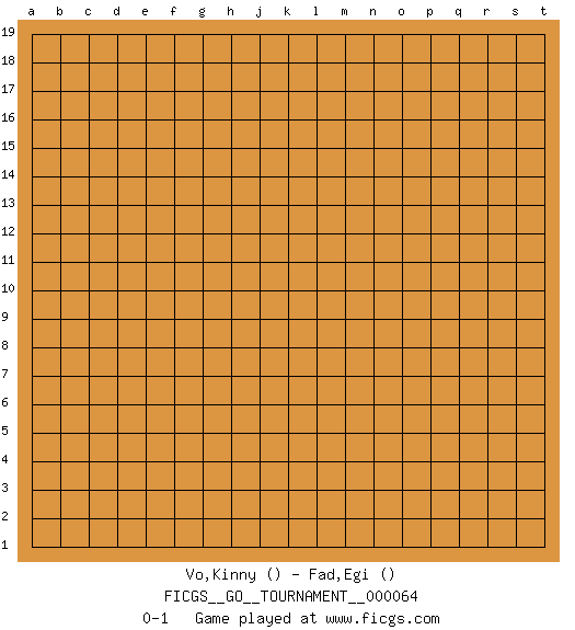 Last move : 0-1 2020 May 24 5:43:7 [Event "FICGS__GO__TOURNAMENT__000064"] [Site "FICGS"] [Date "2020.04.23"] [Round "1"] [Black "Vo,Kinny"] [White "Fad,Egi"] [Result "0-1"] 0-1 This go game has been lost on time (started : 2020.04.23 23:14:21) Here are the names of the openings (joseki) played in the four corners : Player White won this Go (weiqi, baduk) game. Follow this game move after move (download)You don't have to be really good anymore to get good results. What's happening with chess is that it's gradually losing its place as the par excellence of intellectual activity. Smart people in search of a challenging board game might try a game called Go. (Hans Berliner, The New York Times, 2003) Lamb in skin of tiger, still fears the wolf. (Chinese proverb)