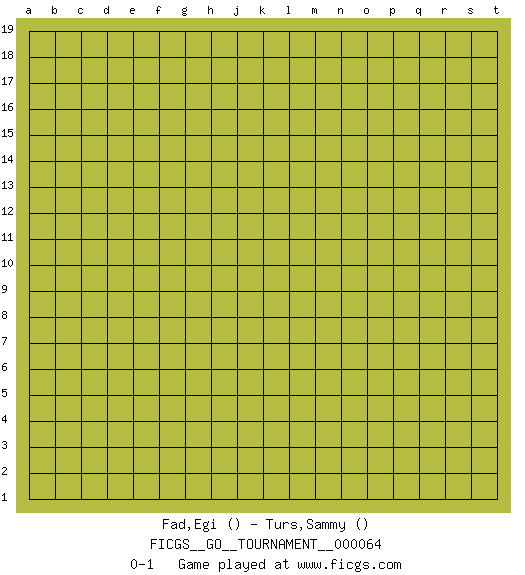 Last move : 0-1 2020 May 24 5:43:7 [Event "FICGS__GO__TOURNAMENT__000064"] [Site "FICGS"] [Date "2020.04.23"] [Round "1"] [Black "Fad,Egi"] [White "Turs,Sammy"] [Result "0-1"] 0-1 This go game has been lost on time (started : 2020.04.23 23:14:21) Here are the names of the openings (joseki) played in the four corners : Player White won this Go (weiqi, baduk) game. Follow this game move after move (download)The L-group is dead. (Anonymous) Men should grow up. - Yeah. And dogs should stop licking themselves. It's not gonna happen. (Gregory House to Dr. Cameron, House M.D.)