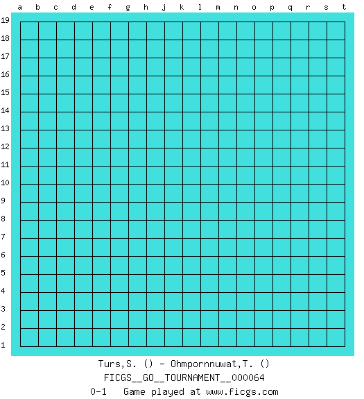 Last move : 0-1 2020 May 24 5:43:7 [Event "FICGS__GO__TOURNAMENT__000064"] [Site "FICGS"] [Date "2020.04.23"] [Round "1"] [Black "Turs,Sammy"] [White "Ohmpornnuwat,Tanapong"] [Result "0-1"] 0-1 This go game has been lost on time (started : 2020.04.23 23:14:21) Here are the names of the openings (joseki) played in the four corners : Player White won this Go (weiqi, baduk) game. Follow this game move after move (download)Go is to western chess what philosophy is to double entry accounting. (from Shibumi, by Trevanian) Whenever people agree with me, I always feel I must be wrong. (Oscar Wilde)
