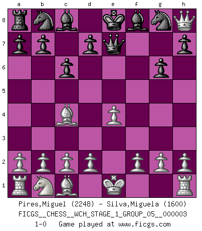 Last move : 1-0 2007 August 25 5:30:12 [Event "FICGS__CHESS__WCH_STAGE_1_GROUP_05__000003"] [Site "FICGS"] [Date "2007.07.11"] [Round "1"] [White "Pires,Miguel"] [Black "Silva,Miguela"] [Result "1-0"] [WhiteElo "2248"] [BlackElo "1600"] 1.e4 e5 2.Nf3 f6 3.Bc4 c6 4.Nxe5 fxe5 5.Qh5+ g6 6.Qxe5+ Qe7 7.Qxh8 1-0 This chess game has been lost on time (started : 2007.07.11 16:54:55) Damiano's defense Player White won this chess game. Follow this game move after move (download)All I want to do, ever, is just play Chess. (Bobby Fischer) Weshalb minderdergeübte Spieler mit g2-g4 beginnen? Die betreffenden sind unschlüssig, ob sie nun rechts (h4) oder links (f4) beginnen sollen, und in ihrer Ratlosigkeit entschliessen sie sich nach guter Bürgerart dazu, den goldenen Mittelweg zu wählen. (Aaron Nimzowitsch) El Ajedrez es sobre todo, ¡una pelea!. (Emanuel Lasker) Aucun coup ne doit être joué sans but. (Pedro Damiano) There are three kinds of lies: lies, damned lies and statistics. (Mark Twain)