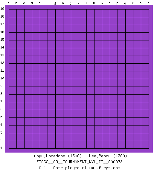 Last move : 0-1 2020 May 26 7:24:28 [Event "FICGS__GO__TOURNAMENT_KYU_II__000072"] [Site "FICGS"] [Date "2020.04.25"] [Round "1"] [Black "Lungu,Loredana"] [White "Lee,Penny"] [Result "0-1"] [Rating 1 "1500"] [Rating 2 "1200"] 0-1 This go game has been lost on time (started : 2020.04.25 20:1:39) Here are the names of the openings (joseki) played in the four corners : Player White won this Go (weiqi, baduk) game. Follow this game move after move (download)Learn the eye-stealing tesuji. (Anonymous) The production of too many useful things results in too many useless people. (Karl Marx)