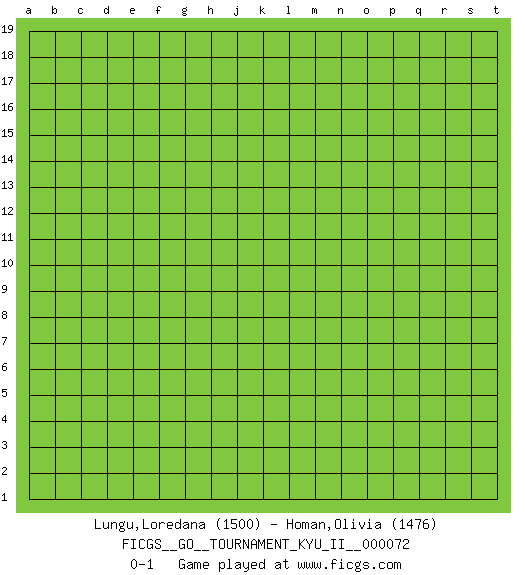 Last move : 0-1 2020 May 26 7:24:28 [Event "FICGS__GO__TOURNAMENT_KYU_II__000072"] [Site "FICGS"] [Date "2020.04.25"] [Round "1"] [Black "Lungu,Loredana"] [White "Homan,Olivia"] [Result "0-1"] [Rating 1 "1500"] [Rating 2 "1476"] 0-1 This go game has been lost on time (started : 2020.04.25 20:1:39) Here are the names of the openings (joseki) played in the four corners : Player White won this Go (weiqi, baduk) game. Follow this game move after move (download)Extend one hand from the cutting points. (Anonymous) Tomorrow's what you make of it. (Horatio Caine, C.S.I. Miami)