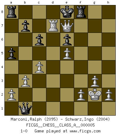Last move : 1-0 2006 July 13 23:0:58 [Event "FICGS__CHESS__CLASS_A__000005"] [Site "FICGS"] [Date "2006.06.20"] [Round "1"] [White "Marconi,Ralph"] [Black "Schwarz,Ingo"] [Result "1-0"] [WhiteElo "2095"] [BlackElo "2004"] 1.d4 d5 2.c4 c6 3.Nf3 Nf6 4.Nc3 e6 5.e3 Be7 6.Bd3 O-O 7.O-O Nbd7 8.b3 Re8 9.Bb2 Nf8 10.e4 dxe4 11.Nxe4 Nxe4 12.Bxe4 f5 13.Bc2 Bf6 14.Qe2 Ng6 15.Rfd1 Qc7 16.Bxf5 Qf7 17.Be4 Nf4 18.Qe3 g5 19.Ne5 Bxe5 20.dxe5 h6 21.Rd6 a5 22.Rad1 Ng6 23.Qh3 Rf8 24.R1d2 Nh4 25.g3 Nf5 26.Bxf5 Qxf5 27.Qxh6 Qb1+ 28.Bc1 Qxc1+ 29.Kg2 Qb1 30.Qxg5+ Kf7 31.Rd7+ Bxd7 32.Rxd7+ Ke8 33.Qe7+ 1-0 QGD Slav : 4.Nc3 Kingside Castling by player Black (move 6) Kingside Castling by player White (move 7) Player White won this chess game. Follow this game move after move (download)Chess, like any creative activity, can exist only through the combined efforts of those who have creative talent, and those who have the ability to organize their creative work. (Mikhail Botvinnik) Ein Buch ist ein Spiegel; wenn ein Affe hineinsieht, so kann kein Apostel heraus gucken. (Georg Christoph Lichtenberg) Cuando tengo las piezas blancas, yo gano porque soy blanco; Cuando tengo las piezas negras, yo gano porque soy Bogolyubov. (Bogolyubov) Karpov est une pièce de musée. (Garry Kasparov) When the going gets tactical, the computers get going. (Hyatt)