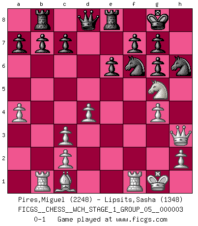 Last move : 0-1 2007 September 1 12:32:37 [Event "FICGS__CHESS__WCH_STAGE_1_GROUP_05__000003"] [Site "FICGS"] [Date "2007.07.11"] [Round "1"] [White "Pires,Miguel"] [Black "Lipsits,Sasha"] [Result "0-1"] [WhiteElo "2248"] [BlackElo "1348"] 1.e4 e6 2.d4 d5 3.Nc3 Bb4 4.a3 Bxc3+ 5.bxc3 dxe4 6.f3 Bd7 7.Nh3 Bc6 8.fxe4 Bxe4 9.Ng5 Bg6 10.Bd3 Nf6 11.O-O Nc6 12.Rb1 Rb8 13.a4 O-O 14.Bxg6 hxg6 15.Qe1 Ne7 16.Qh4 Nf5 17.Qh3 Re8 18.g4 Nh6 0-1 This chess game has been lost on time (started : 2007.07.11 16:54:55) French : Winawer (Nimzovich) variation Kingside Castling by player White (move 11) Kingside Castling by player Black (move 13) Player Black won this chess game. Follow this game move after move (download)The passion for playing Chess is one of the most unaccountable in the world. (H.G. Wells) Ja, jede Frau in Holland liebt mich bestimmt, und alle Männer hassen mich. (Loek van Wely) Puntos débiles o agujeros en la posición de tu oponente deben de ser ocupados por piezas, no Peones. (Siegbert Tarrasch) Votre seul travail dans les ouvertures est d'obtenir un milieu de partie jouable. (Lajos Portish) Don't anthropomorphize computers - they hate it. (Anonymous)