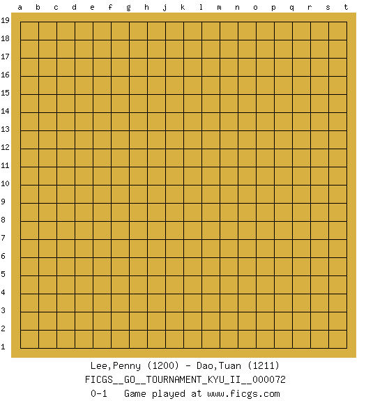 Last move : 0-1 2020 May 26 7:24:28 [Event "FICGS__GO__TOURNAMENT_KYU_II__000072"] [Site "FICGS"] [Date "2020.04.25"] [Round "1"] [Black "Lee,Penny"] [White "Dao,Tuan"] [Result "0-1"] [Rating 1 "1200"] [Rating 2 "1211"] 0-1 This go game has been lost on time (started : 2020.04.25 20:1:39) Here are the names of the openings (joseki) played in the four corners : Player White won this Go (weiqi, baduk) game. Follow this game move after move (download)Don't get surrounded ! Ever ! (Anonymous) The question of whether computers can think is just like question of whether submarines can swim. (Edsger W. Dijkstra)