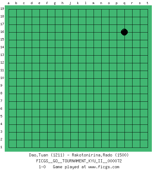 Last move : 1-0 2020 May 26 7:24:28 [Event "FICGS__GO__TOURNAMENT_KYU_II__000072"] [Site "FICGS"] [Date "2020.04.25"] [Round "1"] [Black "Dao,Tuan"] [White "Rakotonirina,Rado"] [Result "1-0"] [Rating 1 "1211"] [Rating 2 "1500"] 1.q16 1-0 This go game has been lost on time (started : 2020.04.25 20:1:39) Here are the names of the openings (joseki) played in the four corners : Player Black won this Go (weiqi, baduk) game. Follow this game move after move (download)When you study joseki, you lose two stones in strength. (Anonymous) You can only get smarter by playing a smarter opponent. (Revolver, movie)