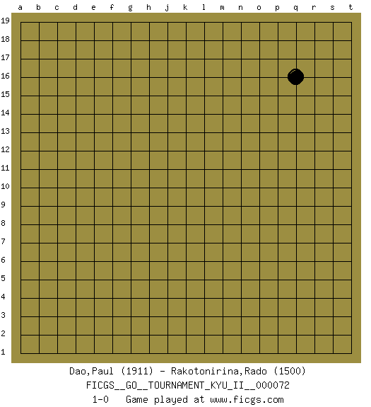 Last move : 1-0 2020 May 26 7:24:28 [Event "FICGS__GO__TOURNAMENT_KYU_II__000072"] [Site "FICGS"] [Date "2020.04.25"] [Round "1"] [Black "Dao,Paul"] [White "Rakotonirina,Rado"] [Result "1-0"] [Rating 1 "1911"] [Rating 2 "1500"] 1.q16 1-0 This go game has been lost on time (started : 2020.04.25 20:1:39) Here are the names of the openings (joseki) played in the four corners : Player Black won this Go (weiqi, baduk) game. Follow this game move after move (download)At the head of two stones in a row, play hane. (Anonymous) Nobody is always a winner, and anybody who says he is, is either a liar or doesn't play poker. (Amarillo Slim)