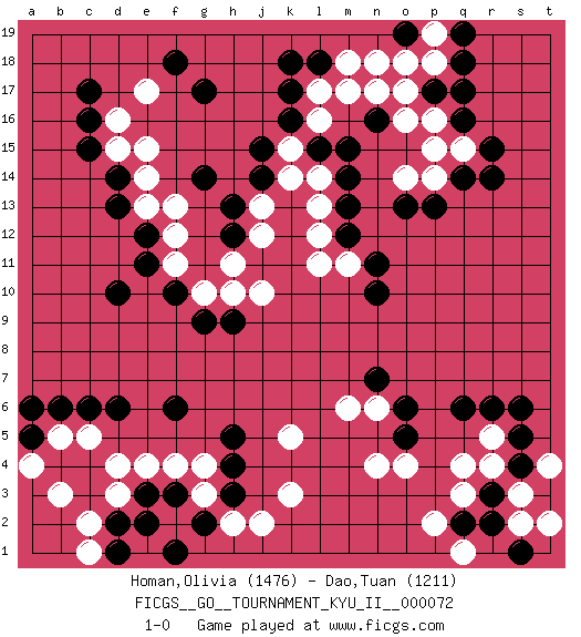 Last move : 1-0 2020 May 26 7:45:1 [Event "FICGS__GO__TOURNAMENT_KYU_II__000072 "] [Site "FICGS"] [Date "2020.04.25"] [Round "1"] [Black "Homan,Olivia "] [White "Dao,Tuan "] [Result "1-0"] [Rating 1 "1476"] [Rating 2 "1211"] 1.q16 q4 2.c16 d4 3.c6 c5 4.d6 f4 5.d10 e17 6.g17 e15 7.d14 e14 8.d13 e13 9.e12 f12 10.e11 f11 11.f10 g10 12.g9 h10 13.h9 j10 14.k17 o17 15.p17 o16 16.q14 l16 17.k16 l17 18.l18 m18 19.k18 k15 20.j15 k14 21.j14 j13 22.h13 j12 23.g14 f13 24.h12 h11 25.l15 l14 26.m15 m17 27.m14 l13 28.m13 l12 29.m12 l11 30.n10 m11 31.n11 o14 32.o13 p14 33.p13 q15 34.r15 p15 35.r14 p16 36.q17 p18 37.q18 p19 38.q19 n18 39.o19 o18 40.n16 n17 41.h3 k3 42.h5 k5 43.e3 e4 44.f3 d3 45.f6 g4 46.h4 g3 47.g2 f2 48.e2 h2 49.f1 j2 50.d2 c2 51.d1 c1 52.b6 b5 53.a5 a4 54.a6 b3 55.r6 r5 56.q6 o4 57.r3 q3 58.s5 r4 59.s4 s3 60.r2 s2 61.q2 p2 62.t3 t2 63.s1 t4 64.s6 q1 65.o6 n6 66.n7 m6 67.o5 n4 68.c17 d15 69.c15 d16 70.f18 1-0 Here are the names of the openings (joseki) played in the four corners : Corner d4 : d4 c6Hoshi (Hwajeom, Seongjeom, Xingwei`) 4-4 Point. The star or hoshi (4-4) point, emphasizing influence at the potential expense of territory.Ikken Kakari (Hankan Keolch'im, Yi Gua`jiao~, 1-Space Low Approach). Black 2 is the standard approach move to the 4-4. Corner d16 : c16 e17Komoku (Somok, Xiao~mu`) 3-4 Point. The komoku (3-4) point is the traditional corner enclosure move..Ikken Kakari (Hankan Keolch'im, Yi Gua`jiao~, 1-Space Low Pincer). The small knight move is the basic approach move to the 3-4 point stone. It has been continually used for over four centuries. There are limitless variations, with new moves constantly being discovered. White 2 opens the door to a treaure store of joseki. Corner q16 : q16 o17Hoshi (Hwajeom, Seongjeom, Xingwei`) 4-4 Point. The star or hoshi (4-4) point, emphasizing influence at the potential expense of territory.Ikken Kakari (Hankan Keolch'im, Yi Gua`jiao~, 1-Space Low Approach). White 2 is the standard approach move to the 4-4. Corner q4 : q4 r6Hoshi (Hwajeom, Seongjeom, Xingwei`) 4-4 Point. The star or hoshi (4-4) point, emphasizing influence at the potential expense of territory.Ikken Kakari (Hankan Keolch'im, Yi Gua`jiao~, 1-Space Low Approach). Black 2 is the standard approach move to the 4-4. Player Black won this Go (weiqi, baduk) game.Follow this game move after move (download ) Sacrifice for shape. (Anonymous) Luck is when opportunity knocks and you answer. (Anonymous)