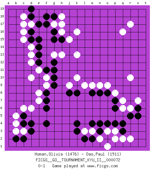 Last move : 0-1 2020 May 23 17:7:49 [Event "FICGS__GO__TOURNAMENT_KYU_II__000072 "] [Site "FICGS"] [Date "2020.04.25"] [Round "1"] [Black "Homan,Olivia "] [White "Dao,Paul "] [Result "0-1"] [Rating 1 "1476"] [Rating 2 "1911"] 1.q4 q16 2.d4 c16 3.k4 r6 4.r5 q6 5.o4 r10 6.s6 s7 7.s5 c6 8.c5 d6 9.f4 d10 10.e17 g17 11.e15 d14 12.e14 d13 13.e13 d12 14.e12 e11 15.f11 f10 16.g11 g13 17.g12 h13 18.g10 f9 19.g9 k16 20.f8 e8 21.f7 e7 22.f6 m3 23.m4 p3 24.p4 o3 25.n3 n2 26.n4 l3 27.k3 r2 28.q3 q2 29.o2 p2 30.m2 o1 31.l2 d17 32.d18 c18 33.d16 c17 34.d15 c15 35.g15 h16 36.h15 j15 37.g16 h17 38.f17 k13 39.g18 h18 40.f18 r17 41.d19 k10 42.k8 m9 43.m8 n9 44.n8 o9 45.o8 p8 46.p7 q7 47.p6 c3 48.d3 b5 49.c4 b4 50.c2 b3 51.b2 j9 52.j8 l9 0-1 Here are the names of the openings (joseki) played in the four corners : Corner q4 : q4 r6Hoshi (Hwajeom, Seongjeom, Xingwei`) 4-4 Point. The star or hoshi (4-4) point, emphasizing influence at the potential expense of territory.Ikken Kakari (Hankan Keolch'im, Yi Gua`jiao~, 1-Space Low Approach). White 2 is the standard approach move to the 4-4. Corner d4 : d4 c6Hoshi (Hwajeom, Seongjeom, Xingwei`) 4-4 Point. The star or hoshi (4-4) point, emphasizing influence at the potential expense of territory.Ikken Kakari (Hankan Keolch'im, Yi Gua`jiao~, 1-Space Low Approach). White 2 is the standard approach move to the 4-4. Corner d16 : c16 e17Komoku (Somok, Xiao~mu`) 3-4 Point. The komoku (3-4) point is the traditional corner enclosure move..Ikken Kakari (Hankan Keolch'im, Yi Gua`jiao~, 1-Space Low Pincer). The small knight move is the basic approach move to the 3-4 point stone. It has been continually used for over four centuries. There are limitless variations, with new moves constantly being discovered. Black 2 opens the door to a treaure store of joseki. Player White won this Go (weiqi, baduk) game.Follow this game move after move (download ) One point in the center is worth ten in the corner. (Anonymous) Some people are so afraid to die that they never begin to live. (Henry Van Dyke)