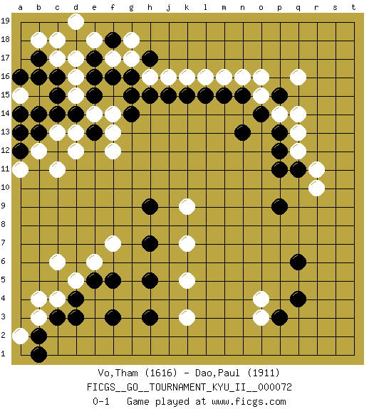 Last move : 0-1 2020 May 26 7:50:26 [Event "FICGS__GO__TOURNAMENT_KYU_II__000072"] [Site "FICGS"] [Date "2020.04.25"] [Round "1"] [Black "Vo,Tham"] [White "Dao,Paul"] [Result "0-1"] [Rating 1 "1616"] [Rating 2 "1911"] 1.q4 d16 2.d4 q16 3.c14 f17 4.c16 c17 5.b16 d15 6.c15 d13 7.d14 e14 8.e13 d12 9.e15 f14 10.e16 d17 11.e17 e18 12.b17 b18 13.d18 c18 14.f18 d19 15.f16 g17 16.g16 h16 17.h17 g18 18.h15 j16 19.g15 f12 20.g14 f13 21.j15 k16 22.k15 l16 23.l15 m16 24.m15 n16 25.n15 o15 26.o14 p14 27.p15 o16 28.p13 q14 29.n13 q13 30.p12 q12 31.p11 r10 32.q11 r11 33.p9 c6 34.f3 b12 35.b13 c13 36.b14 a15 37.a16 a13 38.a14 c11 39.a12 a11 40.a13 o3 41.p3 o4 42.q6 k3 43.h3 k5 44.h5 k7 45.h7 b4 46.c3 b3 47.b2 c4 48.d3 a2 49.b1 d5 50.e5 e6 51.f5 f7 52.h9 k9 0-1 Here are the names of the openings (joseki) played in the four corners : Corner d16 : d16 c14 Hoshi (Hwajeom, Seongjeom, Xingwei`) 4-4 Point. The star or hoshi (4-4) point, emphasizing influence at the potential expense of territory. Ikken Kakari (Hankan Keolch'im, Yi Gua`jiao~, 1-Space Low Approach). Black 2 is the standard approach move to the 4-4. Corner d4 : d4 c6 Hoshi (Hwajeom, Seongjeom, Xingwei`) 4-4 Point. The star or hoshi (4-4) point, emphasizing influence at the potential expense of territory. Ikken Kakari (Hankan Keolch'im, Yi Gua`jiao~, 1-Space Low Approach). White 2 is the standard approach move to the 4-4. Player White won this Go (weiqi, baduk) game. Follow this game move after move (download)Win the early ko to win the game. (Anonymous) A clear conscience is usually the sign of a bad memory. (Unknown)