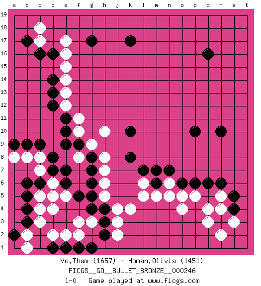 Last move : 1-0 2020 April 28 8:55:52 [Event "FICGS__GO__BULLET_BRONZE__000246"] [Site "FICGS"] [Date "2020.04.28"] [Round "1"] [Black "Vo,Tham"] [White "Homan,Olivia"] [Result "1-0"] [Rating 1 "1657"] [Rating 2 "1451"] 1.q16 q4 2.c16 d4 3.c6 f3 4.b4 c3 5.c9 k4 6.r6 r5 7.q6 o4 8.r10 e17 9.g17 e15 10.d14 e14 11.d13 e13 12.d12 e12 13.e11 f11 14.e10 f10 15.f9 g9 16.g8 f8 17.e9 h8 18.g7 h10 19.k17 h7 20.g6 h6 21.g5 h5 22.g4 g3 23.h4 j4 24.h3 j3 25.h2 j2 26.b3 b2 27.a2 b1 28.e1 d2 29.d1 e2 30.g1 f2 31.f1 e5 32.e6 d6 33.d7 d5 34.e7 c5 35.b5 c7 36.b6 c8 37.d8 b8 38.b9 a8 39.a9 c17 40.b17 c18 41.d16 e16 42.r3 q3 43.s5 r4 44.s4 s3 45.p10 r2 46.o6 m5 47.m7 n6 48.n7 o5 49.m6 n5 50.p6 l6 51.l7 l5 52.k10 c4 53.k8 p5 54.f5 1-0 Here are the names of the openings (joseki) played in the four corners : Corner d4 : d4 c6 Hoshi (Hwajeom, Seongjeom, Xingwei`) 4-4 Point. The star or hoshi (4-4) point, emphasizing influence at the potential expense of territory. Ikken Kakari (Hankan Keolch'im, Yi Gua`jiao~, 1-Space Low Approach). Black 2 is the standard approach move to the 4-4. Corner q4 : q4 r6 Hoshi (Hwajeom, Seongjeom, Xingwei`) 4-4 Point. The star or hoshi (4-4) point, emphasizing influence at the potential expense of territory. Ikken Kakari (Hankan Keolch'im, Yi Gua`jiao~, 1-Space Low Approach). Black 2 is the standard approach move to the 4-4. Corner d16 : c16 e17 Komoku (Somok, Xiao~mu`) 3-4 Point. The komoku (3-4) point is the traditional corner enclosure move.. Ikken Kakari (Hankan Keolch'im, Yi Gua`jiao~, 1-Space Low Pincer). The small knight move is the basic approach move to the 3-4 point stone. It has been continually used for over four centuries. There are limitless variations, with new moves constantly being discovered. White 2 opens the door to a treaure store of joseki. Player Black won this Go (weiqi, baduk) game. Follow this game move after move (download)I really believe that Go is destined to take the place of Chess as the leading intellectual game of the Occident, just as it has reigned supreme in the Orient for some four thousand years. (Edward Lasker, international chess master) I just play for fun. (Anna Kournikova)