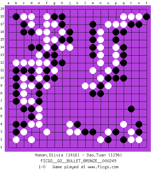 Last move : 1-0 2020 April 28 20:3:4 [Event "FICGS__GO__BULLET_BRONZE__000249"] [Site "FICGS"] [Date "2020.04.28"] [Round "1"] [Black "Homan,Olivia"] [White "Dao,Tuan"] [Result "1-0"] [Rating 1 "1416"] [Rating 2 "1196"] 1.q16 q4 2.d16 d4 3.r6 o3 4.q10 o17 5.q14 q17 6.r17 q18 7.p16 r18 8.s17 s18 9.t18 p17 10.m17 n16 11.m16 n15 12.m15 n14 13.m14 n13 14.m13 n12 15.q12 p13 16.q13 p14 17.p15 p12 18.p11 o11 19.o10 n10 20.n9 o9 21.p10 m9 22.n8 m11 23.m8 l9 24.d10 f17 25.h17 f15 26.d14 d18 27.c17 c18 28.b18 d17 29.c16 e16 30.g18 f18 31.g16 f16 32.c6 f3 33.b4 c3 34.b3 b2 35.c4 d2 36.d5 e4 37.f13 g15 38.h15 g17 39.h18 h16 40.j16 h14 41.j15 j14 42.g14 f14 43.g13 e13 44.e14 e12 45.f11 f12 46.g12 g11 47.h12 e11 48.f10 e10 49.e9 f9 50.g10 d9 51.e8 c10 52.d11 d12 53.c11 c12 54.b11 b12 55.b10 c9 56.b9 c8 57.b8 c7 58.b7 d7 59.e7 e6 60.d6 e5 61.s4 r3 62.m3 k3 63.k4 j3 64.s3 s2 65.l3 j4 66.q2 r2 67.o2 n2 68.p3 1-0 Here are the names of the openings (joseki) played in the four corners : Corner q4 : q4 r6 Hoshi (Hwajeom, Seongjeom, Xingwei`) 4-4 Point. The star or hoshi (4-4) point, emphasizing influence at the potential expense of territory. Ikken Kakari (Hankan Keolch'im, Yi Gua`jiao~, 1-Space Low Approach). Black 2 is the standard approach move to the 4-4. Corner q16 : q16 o17 Hoshi (Hwajeom, Seongjeom, Xingwei`) 4-4 Point. The star or hoshi (4-4) point, emphasizing influence at the potential expense of territory. Ikken Kakari (Hankan Keolch'im, Yi Gua`jiao~, 1-Space Low Approach). White 2 is the standard approach move to the 4-4. Corner d16 : d16 f17 Hoshi (Hwajeom, Seongjeom, Xingwei`) 4-4 Point. The star or hoshi (4-4) point, emphasizing influence at the potential expense of territory. Ikken Kakari (Hankan Keolch'im, Yi Gua`jiao~, 1-Space Low Approach). White 2 is the standard approach move to the 4-4. Corner d4 : d4 c6 Hoshi (Hwajeom, Seongjeom, Xingwei`) 4-4 Point. The star or hoshi (4-4) point, emphasizing influence at the potential expense of territory. Ikken Kakari (Hankan Keolch'im, Yi Gua`jiao~, 1-Space Low Approach). Black 2 is the standard approach move to the 4-4. Player Black won this Go (weiqi, baduk) game. Follow this game move after move (download)Capture what you cut off. (Anonymous) There is a computer disease that anybody who works with computers knows about. It's a very serious disease and it interferes completely with the work. The trouble with computers is that you 'play' with them ! (Richard P. Feynman)