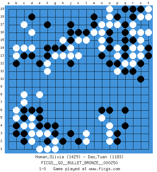 Last move : 1-0 2020 April 28 23:14:22 [Event "FICGS__GO__BULLET_BRONZE__000250"] [Site "FICGS"] [Date "2020.04.28"] [Round "1"] [Black "Homan,Olivia"] [White "Dao,Tuan"] [Result "1-0"] [Rating 1 "1429"] [Rating 2 "1183"] 1.q16 d16 2.q4 d4 3.f17 c14 4.d18 c17 5.j17 r14 6.q11 o17 7.q14 r17 8.q17 r16 9.r15 s15 10.q15 r13 11.q13 r12 12.r11 q12 13.p12 p11 14.s12 s13 15.t13 s14 16.s10 p13 17.o12 p14 18.o16 n16 19.o15 n15 20.o14 n14 21.n13 q18 22.p18 p17 23.r18 s18 24.q19 o18 25.s17 s16 26.t17 t16 27.t14 t18 28.s19 t19 29.r19 o19 30.m17 n17 31.m18 m16 32.l16 l15 33.k16 k15 34.j15 j14 35.h14 h15 36.j16 h13 37.g14 g13 38.f14 k13 39.j12 j13 40.f13 f12 41.e12 f11 42.d13 d14 43.c13 b13 44.b12 b14 45.c6 c8 46.e6 e8 47.f4 f3 48.g3 e3 49.g4 g2 50.h2 g1 51.c3 c4 52.b4 b5 53.b3 b6 54.c5 c7 55.e5 d5 56.d6 d2 57.e4 d3 58.c2 e1 59.f2 f1 60.j3 o3 61.p3 o4 62.q6 l3 63.k2 l2 64.p2 o2 65.o6 n5 66.n6 1-0 Here are the names of the openings (joseki) played in the four corners : Corner d16 : d16 f17 Hoshi (Hwajeom, Seongjeom, Xingwei`) 4-4 Point. The star or hoshi (4-4) point, emphasizing influence at the potential expense of territory. Ikken Kakari (Hankan Keolch'im, Yi Gua`jiao~, 1-Space Low Approach). Black 2 is the standard approach move to the 4-4. Corner q16 : q16 r14 Hoshi (Hwajeom, Seongjeom, Xingwei`) 4-4 Point. The star or hoshi (4-4) point, emphasizing influence at the potential expense of territory. Ikken Kakari (Hankan Keolch'im, Yi Gua`jiao~, 1-Space Low Approach). White 2 is the standard approach move to the 4-4. Corner d4 : d4 c6 Hoshi (Hwajeom, Seongjeom, Xingwei`) 4-4 Point. The star or hoshi (4-4) point, emphasizing influence at the potential expense of territory. Ikken Kakari (Hankan Keolch'im, Yi Gua`jiao~, 1-Space Low Approach). Black 2 is the standard approach move to the 4-4. Corner q4 : q4 o3 Hoshi (Hwajeom, Seongjeom, Xingwei`) 4-4 Point. The star or hoshi (4-4) point, emphasizing influence at the potential expense of territory. Ikken Kakari (Hankan Keolch'im, Yi Gua`jiao~, 1-Space Low Approach). White 2 is the standard approach move to the 4-4. Player Black won this Go (weiqi, baduk) game. Follow this game move after move (download)Each step in a ladder is worth 7 points. (Anonymous) Be who you are, and say what you feel because those who mind don't matter, and those who matter don't mind. (Dr Seuss)