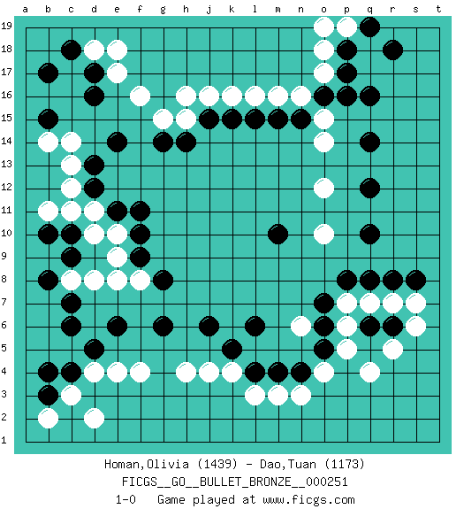 Last move : 1-0 2020 April 29 0:17:45 [Event "FICGS__GO__BULLET_BRONZE__000251"] [Site "FICGS"] [Date "2020.04.29"] [Round "1"] [Black "Homan,Olivia"] [White "Dao,Tuan"] [Result "1-0"] [Rating 1 "1439"] [Rating 2 "1173"] 1.q16 q4 2.d16 d4 3.r6 r5 4.q6 o4 5.q10 o17 6.o16 n16 7.p17 o15 8.p16 o18 9.n15 m16 10.m15 l16 11.l15 k16 12.k15 j16 13.j15 h16 14.g14 f16 15.e14 e17 16.d17 d18 17.c18 e18 18.b17 h15 19.h14 g15 20.c6 c8 21.e6 f4 22.b4 c3 23.c10 e8 24.g6 h4 25.j6 k4 26.l6 n6 27.l4 l3 28.m4 m3 29.n4 n3 30.o5 p5 31.o6 p6 32.o7 p7 33.p8 q7 34.q8 r7 35.r8 s6 36.f9 f8 37.g8 e9 38.f10 e10 39.e11 d11 40.f11 c11 41.b10 b11 42.b8 d10 43.c9 d8 44.c7 c14 45.b15 b14 46.d13 c13 47.d12 c12 48.b3 b2 49.c4 d2 50.d5 e4 51.k5 j4 52.s8 s7 53.p18 p19 54.q19 o19 55.r18 o14 56.q14 o12 57.q12 o10 58.m10 1-0 Here are the names of the openings (joseki) played in the four corners : Corner q4 : q4 r6 Hoshi (Hwajeom, Seongjeom, Xingwei`) 4-4 Point. The star or hoshi (4-4) point, emphasizing influence at the potential expense of territory. Ikken Kakari (Hankan Keolch'im, Yi Gua`jiao~, 1-Space Low Approach). Black 2 is the standard approach move to the 4-4. Corner q16 : q16 o17 Hoshi (Hwajeom, Seongjeom, Xingwei`) 4-4 Point. The star or hoshi (4-4) point, emphasizing influence at the potential expense of territory. Ikken Kakari (Hankan Keolch'im, Yi Gua`jiao~, 1-Space Low Approach). White 2 is the standard approach move to the 4-4. Corner d16 : d16 j16 Hoshi (Hwajeom, Seongjeom, Xingwei`) 4-4 Point. The star or hoshi (4-4) point, emphasizing influence at the potential expense of territory. Corner d4 : d4 c6 Hoshi (Hwajeom, Seongjeom, Xingwei`) 4-4 Point. The star or hoshi (4-4) point, emphasizing influence at the potential expense of territory. Ikken Kakari (Hankan Keolch'im, Yi Gua`jiao~, 1-Space Low Approach). Black 2 is the standard approach move to the 4-4. Player Black won this Go (weiqi, baduk) game. Follow this game move after move (download)Don't reduce your own liberties. (Bill Taylor) Vladimir Ras-Putin is still alive... He is also a good actor, I saw him in the Lord of the Rings. (Rodolfo d'Ettorre)