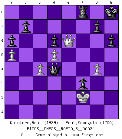 Last move : 0-1 2020 June 20 7:33:33 [Event "FICGS__CHESS__RAPID_B__000341"] [Site "FICGS"] [Date "2020.04.30"] [Round "1"] [White "Quintero,Raul"] [Black "Paul,Samagata"] [Result "0-1"] [WhiteElo "1929"] [BlackElo "1700"] 1.e4 e5 2.Nf3 Nc6 3.Bb5 d6 4.d4 Bd7 5.Nc3 Nf6 6.O-O Be7 7.b3 O-O 8.Bb2 a6 9.Bxc6 Bxc6 10.d5 Bd7 11.h3 c6 12.dxc6 Bxc6 13.Re1 Qc7 14.Nd5 Nxd5 15.exd5 Bd7 16.c4 f5 17.Qd2 Rae8 18.Rac1 Qb8 19.Nh2 Bg5 20.Qxg5 f4 21.g4 fxg3 22.Qxg3 Rf6 23.Kh1 Ref8 24.Rg1 R8f7 25.Rcf1 Qf8 26.f3 Rg6 27.Qh4 Rf4 28.Rg4 Bxg4 29.hxg4 e4 30.Bc1 Rxf3 31.Nxf3 exf3 32.Kg1 Rf6 33.Kf2 h6 34.Re1 Qd8 35.Qh5 Qb6+ 36.Be3 Qa5 37.Qe8+ Kh7 38.Qe4+ Kg8 39.a4 Qc3 40.Rd1 Qxb3 41.a5 Qxd1 42.Qe8+ Rf8 43.Qe6+ Kh8 44.Bd4 Qxd4+ 0-1 Ruy Lopez : Old Steinitz defense Kingside Castling by player White (move 6) Kingside Castling by player Black (move 7) Player Black won this chess game. Follow this game move after move (download)Chess holds its master in its own bonds, shackling the mind and brain so that the inner freedom of the very strongest must suffer. (Albert Einstein) Die größte Kunst beim Schach besteht darin dem Gegner nicht zu zeigen was er tun kann. (Garry Kasparov) Cada Peón es potencialmente una Reina. (James Mason) La tactique est l'élément le plus important du milieu de jeu. (Siegbert Tarrasch) Excelling at chess has long been considered a symbol of more general intelligence. That is an incorrect assumption in my view, as pleasant as it might be. But for the purposes of argument and investigation, chess is, in Russkin-Gutman's words, 'an unparalleled laboratory, since both the learning process and the degree of ability obtained can be objectified and quantified, providing an excellent comparative framework on which to use rigorous analytical techniques.' (The Chess Master and the Computer, by Garry Kasparov - 2010)