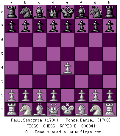 Last move : 1-0 2020 June 2 11:18:14 [Event "FICGS__CHESS__RAPID_B__000341"] [Site "FICGS"] [Date "2020.04.30"] [Round "1"] [White "Paul,Samagata"] [Black "Ponce,Daniel"] [Result "1-0"] [WhiteElo "1700"] [BlackElo "1700"] 1.e4 1-0 This chess game has been lost on time (started : 2020.04.30 22:25:28) King's pawn Opening Player White won this chess game. Follow this game move after move (download)Every Chess master was once a beginner. (Chernev) Mein erstes Ziel war nicht, die Partie zu gewinnen, sondern eine Figur zu opfern. -- der junge (Wilhelm Steinitz) Hasta este punto, las blancas han seguido un análisis bien conocido. Pero ahora el hace un error fatal: empieza a usar su propia cabeza. (Siegbert Tarrasch) Votre seul travail dans les ouvertures est d'obtenir un milieu de partie jouable. (Lajos Portish) Unless in communicating with it one says exactly what one means, trouble is bound to result. (Alan Turing, about computers)