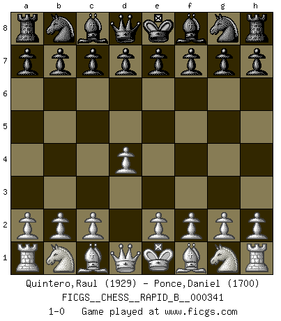 Last move : 1-0 2020 May 31 7:27:7 [Event "FICGS__CHESS__RAPID_B__000341"] [Site "FICGS"] [Date "2020.04.30"] [Round "1"] [White "Quintero,Raul"] [Black "Ponce,Daniel"] [Result "1-0"] [WhiteElo "1929"] [BlackElo "1700"] 1.d4 1-0 This chess game has been lost on time (started : 2020.04.30 22:25:28) Queen's pawn Player White won this chess game. Follow this game move after move (download)Nonsense was the last thing Fischer was interested in, as far as Chess was concerned. (Elie Agur) Sie führen leise Selbstgespräche, schlürfen lautstark ihre Getränke, schmatzen hörbar beim Essen, blasen ihrem Gegenüber Rauch in die Augen, niesen ihm ins Gesicht, starren ihn unverwandt an, bis er sich unter ihren Blicken windet, rutschen ständig auf ihrem Stuhl hin und her, rülpsen und bohren in der Nase. (Anonymous) La belleza de un movimiento no se refleja solo en su apariencia, sino en el pensamiento detrás de él. (Siegbert Tarrasch) Un journaliste : 'Vous préférez avoir une dame de plus sur l'échiquier ou au lit ?' Boris Spassky : 'Ca dépend de la position.' My poor ole parrot... Is not in the circulation of displays ....poo hoo hoo :) (Wayne Lowrance's enigma)