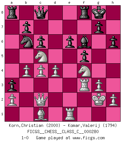 Last move : 1-0 2020 August 8 19:45:37 [Event "FICGS__CHESS__CLASS_C__000280"] [Site "FICGS"] [Date "2020.05.01"] [Round "1"] [White "Korn,Christian"] [Black "Komar,Valerij"] [Result "1-0"] [WhiteElo "2000"] [BlackElo "1794"] 1.d4 Nf6 2.c4 e6 3.g3 Bb4+ 4.Bd2 a5 5.Bg2 O-O 6.Nf3 d5 7.Qc2 Be7 8.O-O Bd7 9.Rd1 a4 10.Ne5 Be8 11.e3 Nbd7 12.Nc3 a3 13.b3 c6 14.Nd3 h6 15.Rab1 Nh7 16.e4 dxe4 17.Nxe4 f5 18.Nc3 Nhf6 19.b4 Nb6 20.Ne2 Ne4 21.Bc1 Qc8 22.Rb3 Bh5 23.Re1 Ng5 24.Nef4 Nf3+ 25.Bxf3 Bxf3 26.Nc5 Bg4 27.f3 Bxf3 28.Rxf3 Bf6 29.Kg2 1-0 Catalan Opening Kingside Castling by player Black (move 5) Kingside Castling by player White (move 8) Player White won this chess game. Follow this game move after move (download)Fischer is the strongest player in the world. In fact, the strongest player who ever lived. (Larry Evans) Wenn Du einsam bist, wenn Du Dich in der Welt wie ein Fremder fühlst, spiele Schach. Das wird Deinen Geist erheben und Dein Ratgeber im Kampf sein. (Aristoteles) Por tratar de evitar la pérdida de una pieza, muchas personas han perdido una partida de Ajedrez. (Savielly Tartakover) Je menace de comprendre la position. (Anonyme) Pretend inferiority and encourage his arrogance. (Sun Tzu)