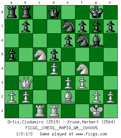 Last move : 1/2-1/2 2020 June 7 17:28:31 [Event "FICGS__CHESS__RAPID_GM__000005"] [Site "FICGS"] [Date "2020.05.02"] [Round "1"] [White "Ortiz,Clodomiro"] [Black "Kruse,Herbert"] [Result "1/2-1/2"] [WhiteElo "2519"] [BlackElo "2564"] 1.d4 Nf6 2.c4 c6 3.Nc3 d5 4.cxd5 cxd5 5.Bf4 Nc6 6.e3 a6 7.Bd3 Bg4 8.Nge2 e6 9.Rc1 Bd6 10.f3 Bh5 11.Na4 O-O 12.Nc5 Qe7 13.Bxd6 Qxd6 14.O-O Rfb8 15.Nf4 Bg6 16.Be2 Ne7 17.Qe1 Nd7 18.Qc3 Nf6 19.Rfd1 Qd8 20.Qb3 a5 1/2-1/2 Queen's pawn game Kingside Castling by player Black (move 11) Kingside Castling by player White (move 14) This chess game ended in a draw. Follow this game move after move (download)Chess is so inspiring that I do not believe a good player is capable of having an evil thought during the game. (Wilhelm Steinitz) Matt entspricht nicht immer den Tatsachen. (Savielly Grigorievitsch Tartakower) EL Ajedrez es como la vida. (Boris Spassky) Si rien de grave n'est détecté lors de l'analyse d'une position, on joue alors le coup. Seconde règle de Blumenfeld. I've never seen so many men wasted so badly. (Blondie in The Good, The Bad and The Ugly)