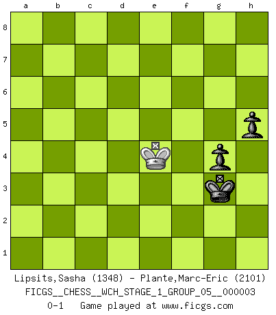 Last move : 0-1 2007 September 3 5:19:40 [Event "FICGS__CHESS__WCH_STAGE_1_GROUP_05__000003"] [Site "FICGS"] [Date "2007.07.11"] [Round "1"] [White "Lipsits,Sasha"] [Black "Plante,Marc-Eric"] [Result "0-1"] [WhiteElo "1348"] [BlackElo "2101"] 1.e4 c5 2.Nf3 d6 3.d4 cxd4 4.Nxd4 Nf6 5.Nc3 a6 6.Bd3 Nc6 7.Nxc6 bxc6 8.O-O g6 9.f4 Bg7 10.Qe1 O-O 11.Qh4 Nd7 12.f5 e6 13.Qxd8 Bd4+ 14.Kh1 Rxd8 15.fxe6 fxe6 16.Na4 Be5 17.Bg5 Rf8 18.Rxf8+ Kxf8 19.Rf1+ Kg7 20.g3 c5 21.Bf4 Bb7 22.b3 g5 23.Bxe5+ Nxe5 24.Kg2 h6 25.Nc3 d5 26.exd5 exd5 27.Re1 Kf6 28.Rf1+ Ke7 29.Kh3 Bc6 30.Re1 Kd6 31.Rf1 Bd7+ 32.Kg2 Nxd3 33.cxd3 Ke5 34.Ne2 Bf5 35.d4+ cxd4 36.Nxd4 Be4+ 37.Nf3+ Bxf3+ 38.Rxf3 Rc8 39.Rf2 d4 40.Kf3 g4+ 41.Ke2 Rc2+ 42.Ke1 Rxf2 43.Kxf2 Ke4 44.Ke2 d3+ 45.Kd2 Kd4 46.a3 h5 47.b4 Kc4 48.a4 Kxb4 49.Kxd3 Kxa4 50.Kc3 Kb5 51.Kb3 a5 52.Ka3 Kc4 53.Ka4 Kd3 54.Kxa5 Ke3 55.Kb4 Kf3 56.Kc4 Kg2 57.Kd4 Kxh2 58.Ke4 Kxg3 0-1 Sicilian : Najdorf Kingside Castling by player White (move 8) Kingside Castling by player Black (move 10) 10 pieces endgame at move 43 : White KPPPP , Black KPPPP WHITE : King + 4 Pawns BLACK : King + 4 Pawns 9 pieces endgame at move 48 : White KPPP , Black KPPPP WHITE : King + 3 Pawns BLACK : King + 4 Pawns 8 pieces endgame at move 49 : White KPPP , Black KPPP WHITE : King + 3 Pawns BLACK : King + 3 Pawns 7 pieces endgame at move 49 : White KPP , Black KPPP WHITE : King + 2 Pawns BLACK : King + 3 Pawns 6 pieces endgame at move 54 : White KPP , Black KPP WHITE : King + 2 Pawns BLACK : King + 2 Pawns 5 pieces endgame at move 57 : White KP , Black KPP WHITE : King + 1 Pawn BLACK : King + 2 Pawns 4 pieces endgame at move 58 : White K , Black KPP WHITE : King + BLACK : King + 2 Pawns Player Black won this chess game. Follow this game move after move (download)It is always better to sacrifice your opponent's men. (Savielly Tartakower) Man kann eine Schachpartie nur gewinnen, wenn das Gleichgewicht gestört ist. In einer Stellung mit ungestörtem Gleichgewicht ist auch das größte Genie hilflos - in der Stellung steckt dann eben kein genialer Einfall. (Wilhelm Steinitz) A la fecha, Fischer esta simplemente un nivel arriba de todos los mejores jugadores de Ajedrez del mundo. (John Jacobs) Les Cavaliers se révèlent fort utiles dans les positions fermées. D'habitude, les Fous sont un peu plus forts que les Cavaliers dans les positions ouvertes. Qu'on le veuille ou non, il restera toujours des exceptions ! Fear is the path to the dark side. Fear leads to anger; anger leads to hate; hate leads to suffering. I sense much fear in you. (Master Yoda in Star Wars ep.1)