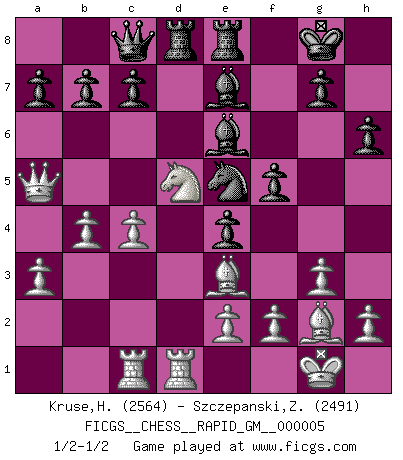 Last move : 1/2-1/2 2020 June 10 9:7:58 [Event "FICGS__CHESS__RAPID_GM__000005"] [Site "FICGS"] [Date "2020.05.02"] [Round "1"] [White "Kruse,Herbert"] [Black "Szczepanski,Zbigniew"] [Result "1/2-1/2"] [WhiteElo "2564"] [BlackElo "2491"] 1.g3 e5 2.c4 Nf6 3.Bg2 d5 4.cxd5 Nxd5 5.Nc3 Nb6 6.d3 Be7 7.Nf3 Nc6 8.O-O Be6 9.Be3 f5 10.Rc1 O-O 11.a3 Re8 12.Nd2 Qd7 13.b4 h6 14.Nc4 Nxc4 15.dxc4 Rad8 16.Qa4 e4 17.Rfd1 Qc8 18.Nd5 Ne5 19.Qa5 1/2-1/2 Benko's Opening Kingside Castling by player White (move 8) Kingside Castling by player Black (move 10) This chess game ended in a draw. Follow this game move after move (download)I believe that Chess possesses a magic that is also a help in advanced age. A rheumatic knee is forgotten during a game of Chess and other events can seem quite unimportant in comparison with a catastrophe on the chessboard. (Vlastimil Hort) Kostenjuk hat keinen Sexappeal. (Loek van Wely) Fischer era un maestro de claridad y un Rey del posicionamiento astuto. Sus oponentes podían ver hacia donde se dirigía pero eran impotentes para detenerlo. (Bruce Pandolfini) On croit qu'il y a plus de mauvais joueurs que de bons joueurs, c'est faux : Il y a autant de joueurs qui gagnent que de joueurs qui perdent. (Philippe Geluck) The general who wins the battle makes many calculations in his temple before the battle is fought. The general who loses makes but few calculations beforehand. (Sun Tzu)