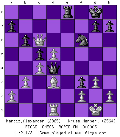 Last move : 1/2-1/2 2020 May 10 20:7:36 [Event "FICGS__CHESS__RAPID_GM__000005"] [Site "FICGS"] [Date "2020.05.02"] [Round "1"] [White "Marciz,Alexander"] [Black "Kruse,Herbert"] [Result "1/2-1/2"] [WhiteElo "2365"] [BlackElo "2564"] 1.d4 Nf6 2.c4 c6 3.Nf3 d5 4.e3 e6 5.b3 b6 6.Bb2 Nbd7 7.Bd3 Bd6 8.Nbd2 Bb7 9.Qe2 O-O 10.O-O Qe7 11.Rad1 Rad8 12.e4 dxe4 13.Nxe4 Nxe4 14.Qxe4 f5 15.Qe3 c5 16.Ng5 e5 17.d5 f4 18.Qh3 Qxg5 19.Qe6+ Rf7 20.Qxd6 f3 21.g3 Re8 22.Rfe1 Rfe7 23.Qc7 Nf6 24.Rxe5 Rxe5 25.Bxe5 Qxe5 26.Qxb7 Qd4 27.Qc6 Kf8 28.Qd6+ Kg8 29.Qc6 Kf8 30.Qd6+ Kg8 31.Qc6 1/2-1/2 Queen's pawn game Kingside Castling by player Black (move 9) Kingside Castling by player White (move 10) This chess game ended in a draw. Follow this game move after move (download)Chess is everything: art, science and sport. (Anatoly Karpov) Korrekt heißt in Deutschland die Haltung eines Mannes, dessen Benehmen nach dem Urteile seiner Nachbarn seiner Stellung angemessen ist. Um korrekt zu sein, muß man sich der Meinung der anderen anpassen... (Emanuel Lasker) Bobby es la celebridad menos entendida y malinterpretada que camina el la faz de esta tierra. (Yasser Seirawan) La menace est plus forte que l'exécution. (Aaron Nimzovitch) If I had no sense of humor, I would long ago have committed suicide. (Mahatma Gandhi)
